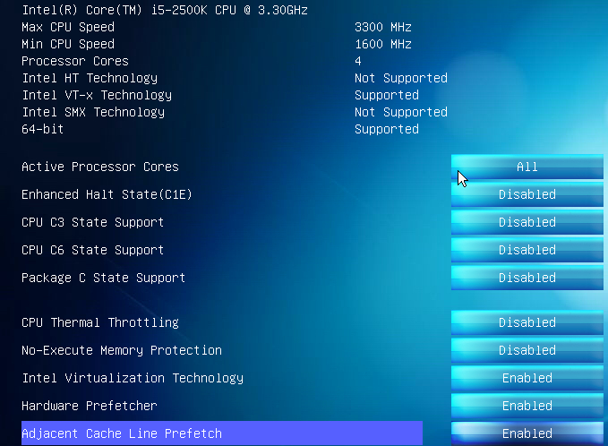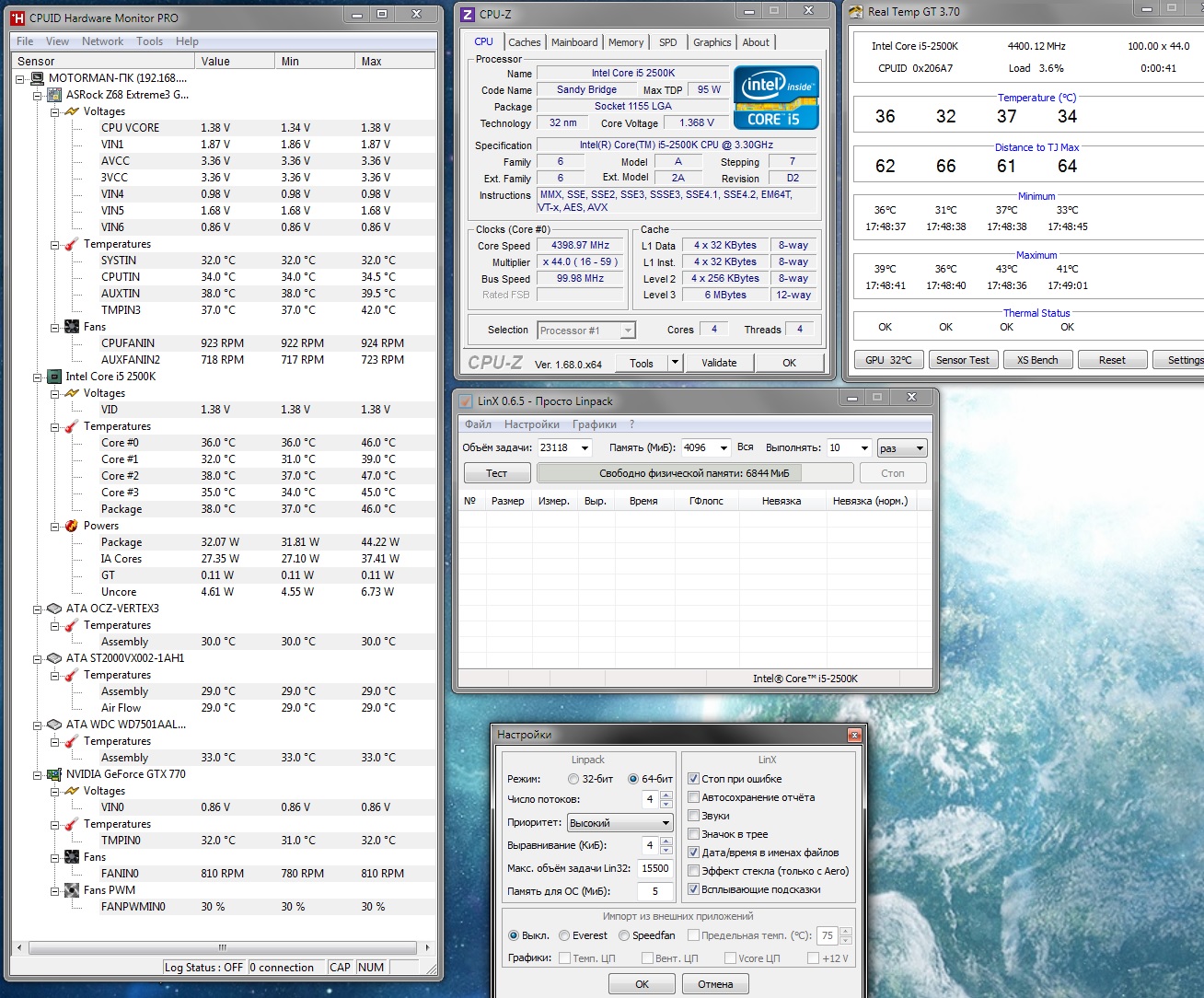 Ребят, неделю уже мурыжу и мурыжу свой 2500К, вот совсем уже отчаялся, помогите советом. Вообщем есть ASRock Z68 Extreme3 Gen3 c версией биоса 2.30 и есть 2500К. Работал он почти два года на дефолтных auto настройках биоса, тогда еще 1.30, со скоростью 4ГГц. И вот сидел я на новогодних каникулах и приспичило мне разогнать его поболя, так сказать. на 1.30 он завелся на 4.5ГГц и прошел все тесты LinX, со всякими настройками и разной продолжительностью - вообщем был стабилен(сколько Vcore ставил - не помню уж) И стремление к прогрессу побудило меня прошить биос до 2.30(будь он проклят). И теперь не хочет ни в какую мой Core i5 проходить линпак даже на 4.3ГГц - постоянно BSOD`ы после 3-4 ого прохода, с ошибками 114, 101, 3b. А с настройками биоса я как только не извращался. Скрины некоторых из настроек биоса я вложил и подписал как я с ними манипулировал. При чем в разных вариациях. Парни - что еще можно выкрутить? Или можно писать каким то макаром в ASRock и клянчить микросхему со старым биосом? И еще: не жестковаты ли настройки Linx? Приоритет может надо выставить "Нормальный" ???