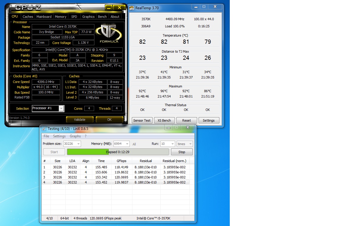 Короче какая-то лютая жесть, линкс я гонял давно, больше года назад, частоты\вольтаж\температуры запомнил и сохранил профили в биосе. Сейчас специально прогнал на 1.2 и 4.5 и увидел сотку!Перепугался и остановил. Хрен знает в чем прикол, неделю назад чистил весь комп от пыли, продул все кулера\радиаторы, перемазал термопасту. Раньше таких температур точно не было. Может конечно эта термодрянь под крышкой окончательно сдохла. Или из-за того, что сейчас в квартире очень жарко(батареи топят, а на улице уже тепло). Или КПТ-8 протухла, т.к. тюбику хрен знает сколько лет уже. Или... больше идей у меня нет. По понятным причинам я не решился прогонять сейчас линкс на 1.25. Решил что 1.2 в нынешней ситуации это борщ, навскидку потестил другие режимы ,подбирал весьма грубо и окончания теста не ждал, но примерную ситуацию отражают, вот что получилось. Жесть какая-то... Еще и по ядрам разброс в 10 градусов.