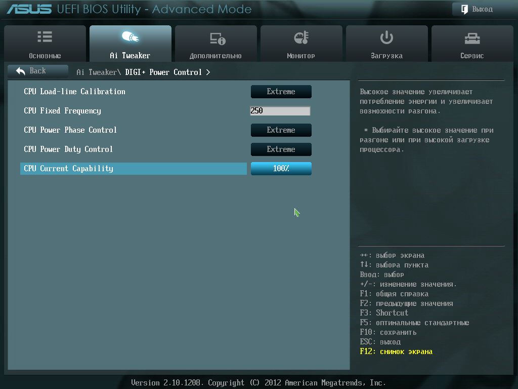 не помню, но то, что режим стоит high, а не ультра и тем более не экстрим - это точно помню. лучше чуть больше дать на проц, чем задирать на ультра/экстрим контроллер, так меньше vrm нагружается-греется. это вычислено не мной, я лишь подтверждаю сей факт, лично проверенный. причём проверенный и на второй асусе - z77-v... но у меня напряжение небольшое, то бишь потребляемая мощность процом/нагрузка на vrm явно невелика. что будет со стабильностью, если на проц дать 1,35 или вообще 1,4В при high - я не знаю. возможно придётся в ультра ставить... эта машина на работе, смогу в понедельник глянуть. более того, могу свои настройки сохранить в файл и скинуть в личку. плата позволяет, находясь в биосе, загрузить настройки из файла. но они будут рабочими для моего конфига, для своего всё равно величины напряжений как минимум на проц и память надо будет подстраивать, не говоря уже про тайминги... глянул скрин - ну какбэ несуразица налицо, сразу же. всё в экстрим, но компатибилити 100 - это же одно с другим не вяжется. на максимум надо тогда ставить, 120 или сколько там позволяется...