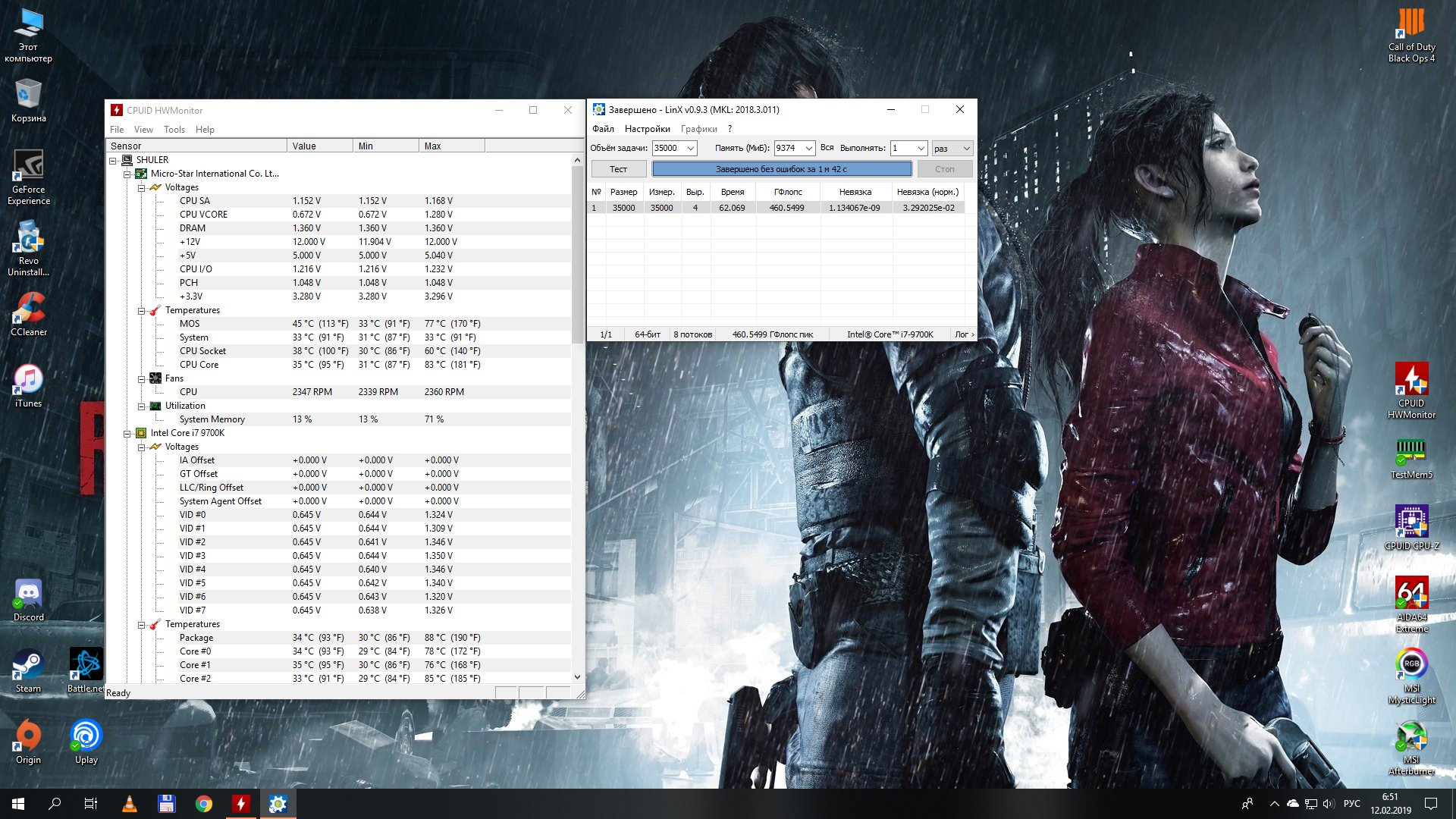 Полученный результат должен иметь следующий вид: Скриншот рабочего стола после прохождения >9 циклов (т.е. между 9 и 10 проходами). Вместе с LinX на рабочем столе должны быть развернуты CPU-Z (первая вкладка) и Core Temp, это обязательный минимум. Такой набор программ даст информацию о напряжении и температурах под нагрузкой-простоем. По желанию можете добавить другие программы, показывающие дополнительную информацию о вашей системе, например третью вкладку CPU-Z, которая покажет модель материнской платы и версию BIOS. Пример результата разгона: Mad Max, 5100 МГц (AVX 0), i7-8086K, HT-ON, Cache 4700, Vcore=1.36V, Batch L805E123, Gigabyte Z370 Aorus Gaming 7 (bios F6), Be Quiet! Dark Rock Pro 4, ЖМ под HS, Windows 10 Pro 64-bit 1809, LinX 0.9.3 64bit.