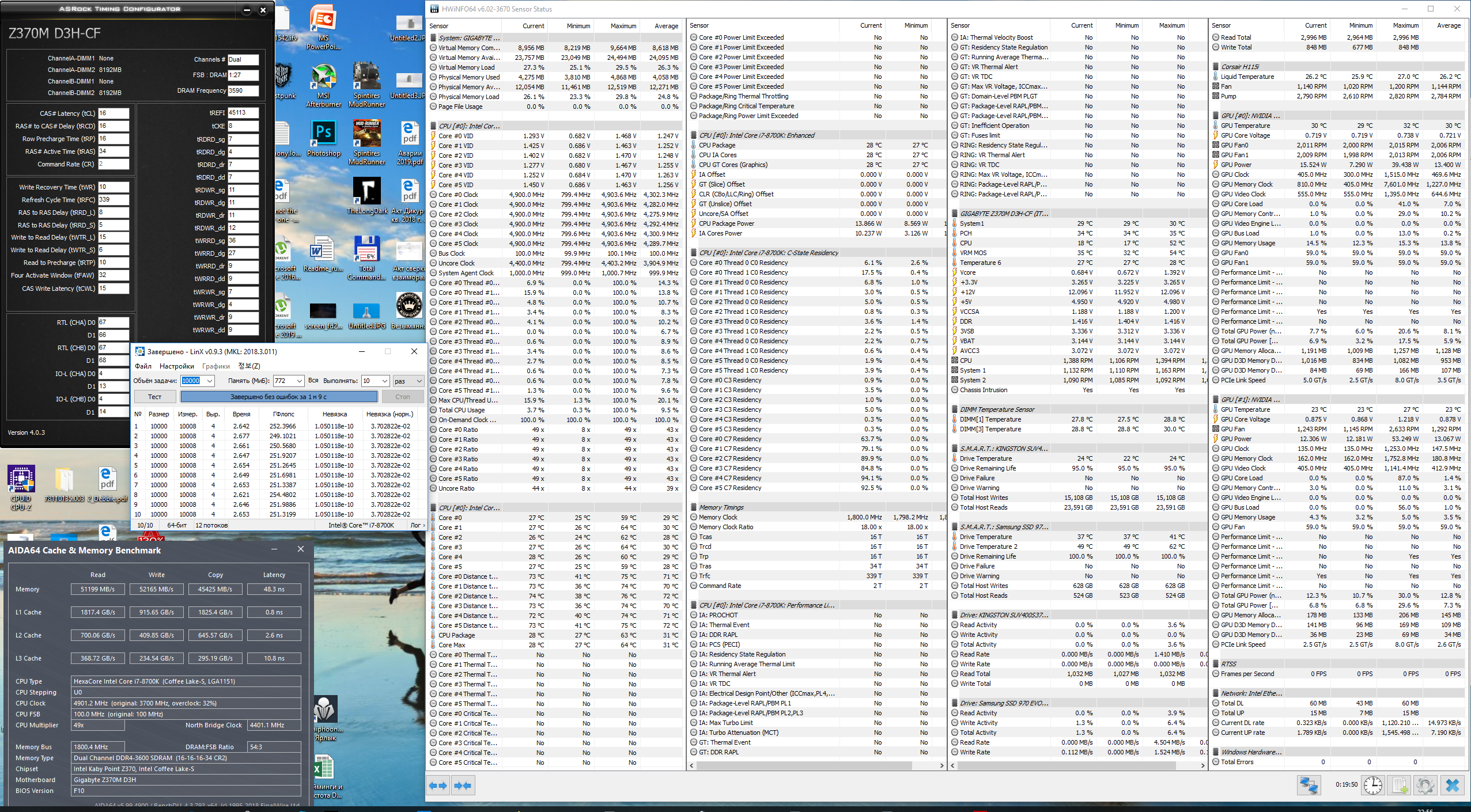 Полученный результат должен иметь следующий вид: Скриншот рабочего стола после прохождения >9 циклов (т.е. между 9 и 10 проходами). Вместе с LinX на рабочем столе должны быть развернуты CPU-Z (первая вкладка) и Core Temp, это обязательный минимум. Такой набор программ даст информацию о напряжении и температурах под нагрузкой-простоем. По желанию можете добавить другие программы, показывающие дополнительную информацию о вашей системе, например третью вкладку CPU-Z, которая покажет модель материнской платы и версию BIOS. Пример результата разгона: Mad Max, 5100 МГц (AVX 0), i7-8086K, HT-ON, Cache 4700, Vcore=1.36V, Batch L805E123, Gigabyte Z370 Aorus Gaming 7 (bios F6), Be Quiet! Dark Rock Pro 4, ЖМ под HS, Windows 10 Pro 64-bit 1809, LinX 0.9.3 64bit.