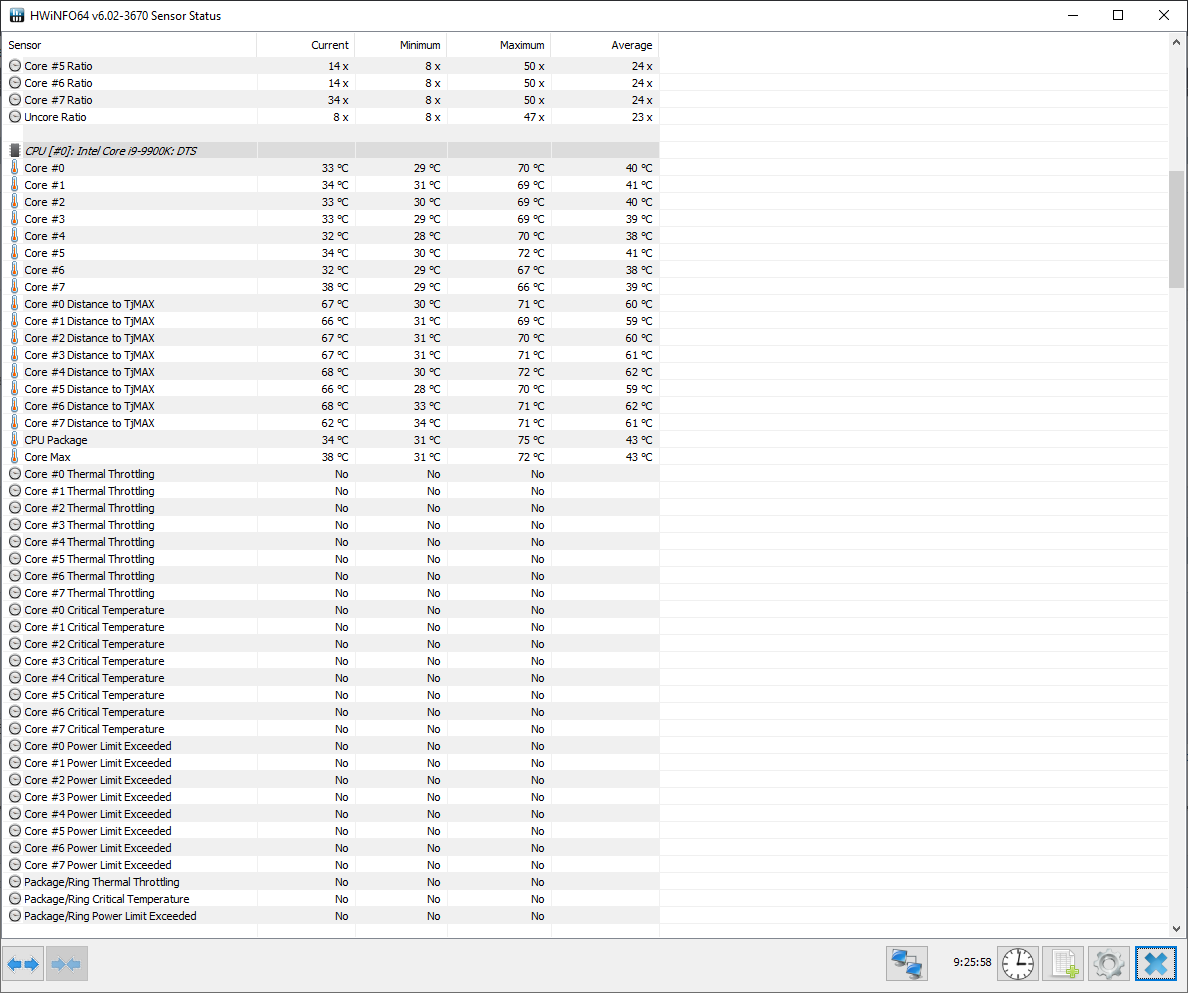 Полученный результат должен иметь следующий вид: Скриншот рабочего стола после прохождения >9 циклов (т.е. между 9 и 10 проходами). Вместе с LinX на рабочем столе должны быть развернуты CPU-Z (первая вкладка) и Core Temp, это обязательный минимум. Такой набор программ даст информацию о напряжении и температурах под нагрузкой-простоем. По желанию можете добавить другие программы, показывающие дополнительную информацию о вашей системе, например третью вкладку CPU-Z, которая покажет модель материнской платы и версию BIOS. Пример результата разгона: Mad Max, 5100 МГц (AVX 0), i7-8086K, HT-ON, Cache 4700, Vcore=1.36V, Batch L805E123, Gigabyte Z370 Aorus Gaming 7 (bios F6), Be Quiet! Dark Rock Pro 4, ЖМ под HS, Windows 10 Pro 64-bit 1809, LinX 0.9.3 64bit.