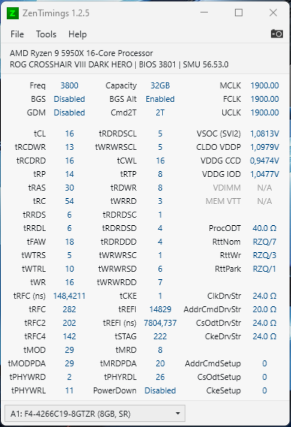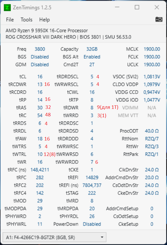 Kolizeum так у тебя GDM off при clkdrvstr = 24 тогда как для отключения с установкой 1т выставляется 60 и потом снижается. Откуда такие сопротивления? ProcODT выставь 36.9, либо оставив нынешний остальные 3 в авто и пару перезагрузок чтобы плата сама выставила. Должно получиться 36.9-43.6 / disabled / off / RZQ/5.
