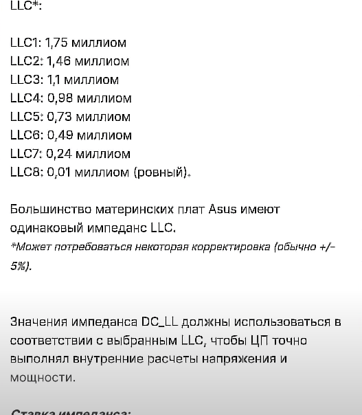 Никакого, потому что стабильность все равно будете проверять под максимальной нагрузкой и нагревом. Других способов корректировать напряжение в зависимости от температуры просто нет. 1. Найдите в одном из свернутых разделов про МП датчик VR VOUT, лучше на него ориентироваться. 2. У асуса есть в биосе опция "Sync ACDC Loadline with VRM Loadline". Можно ее включить и посмотреть в сводке hwinfo, какой DC_LL соответствует выбранному LLC. Потом руками прописать.