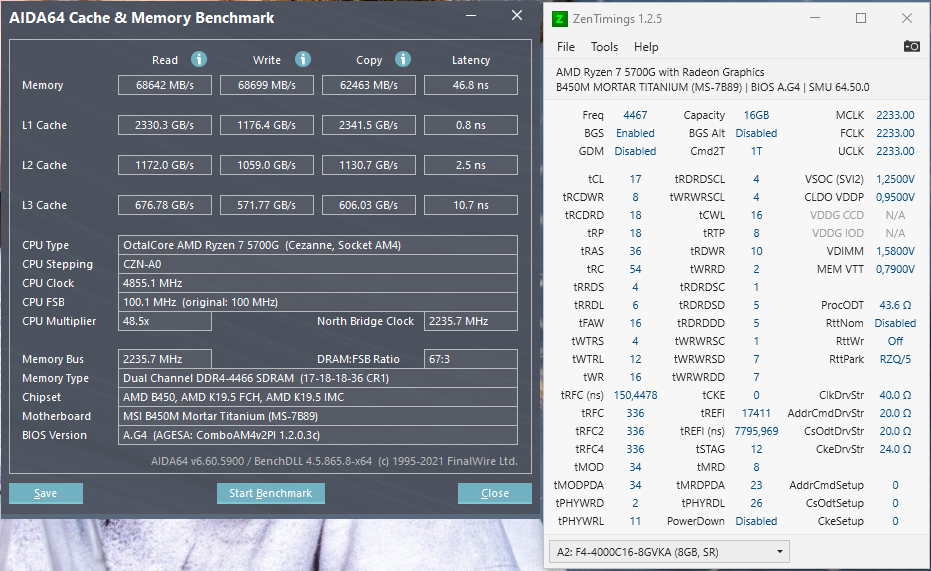 Ничего не находите необычного в двух скринах мембенча AIDA с FCLK 2266mhz и 2233mhz (все остальные настройки идентичные). FireStrike с GPU 2400mhz, ram 4466 mt/s, CPU tuned PBO2: