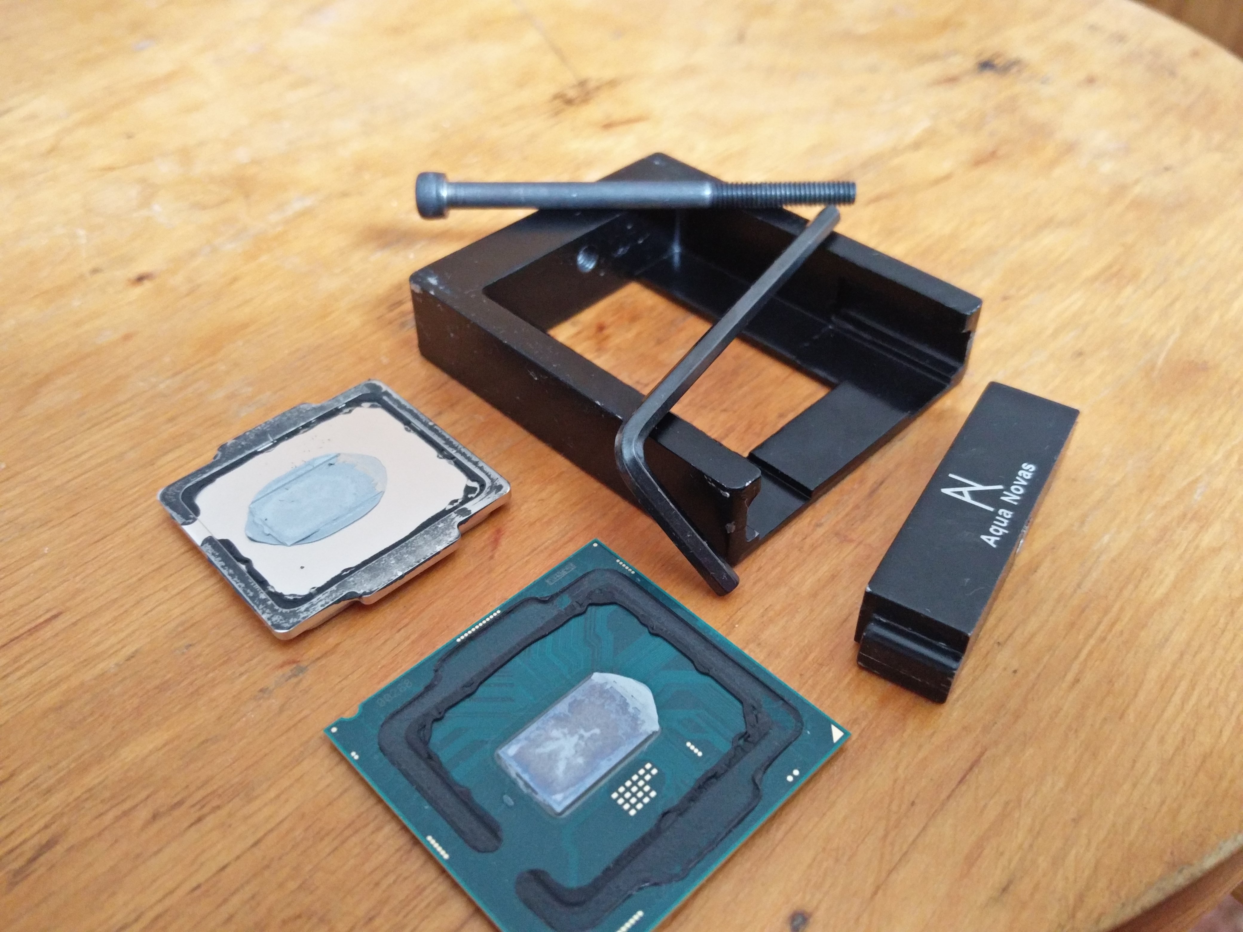 Sgt_Osiris Ничего трудного, хотя волновался сильно - один 3570к убил лезвием вместе с материнкой... Но i5 было как-то неочень жаль... А тут аж голова разболелась при кульминации ... Крышку снял без проблем самой дешёвой спец. приблудой от 3D принтера - пошёл в ближайший автосервис/гараж и зажал в тиски (моих немного не хватило)... Герметик не использовал - установил кристалл в соккет а сверху накинул крышку дрожащими руками и зажал соккетом (у меня вообще весь герметик удалён, т.к. до этого кулер на кристалл ставил). Ещё, в несколько слоёв, "лаком" покрыл открытые элементы у 4790k - из-за них весь страх был. Поверхности протёр спиртом и бумажными полотенцами. Разница температур между ядрами ~8 градусов - меня устраивает - ничего не полировал. Скинул больше 25 градусов. У меня это заняло 2-3 часа с разборкой/установкой и покрытием лака - не спешил. Пару страниц назад всё подробно описал.