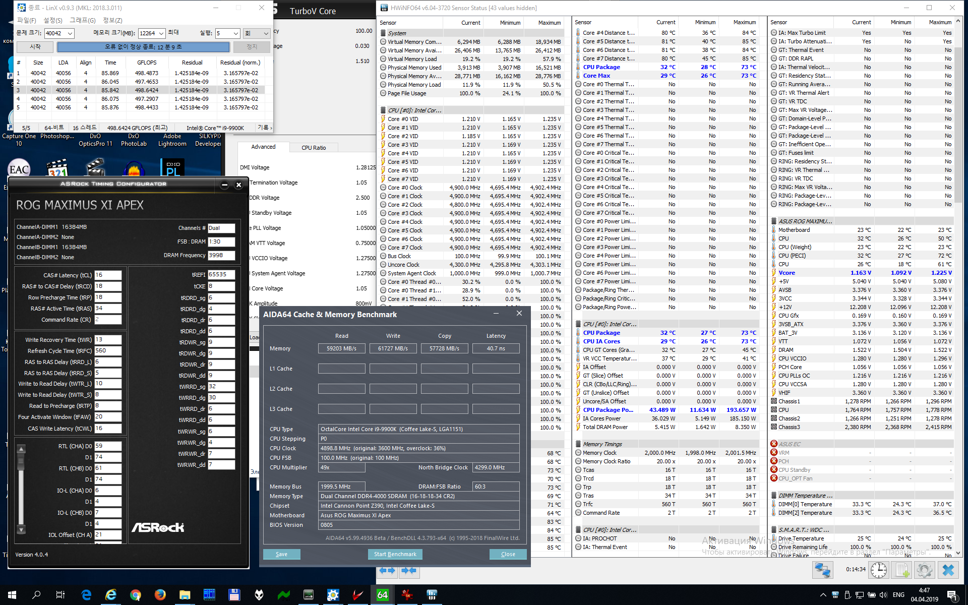 Полученный результат должен иметь следующий вид: Скриншот рабочего стола после прохождения >9 циклов (т.е. между 9 и 10 проходами). Вместе с LinX на рабочем столе должны быть развернуты CPU-Z (первая вкладка) и Core Temp, это обязательный минимум. Такой набор программ даст информацию о напряжении и температурах под нагрузкой-простоем. По желанию можете добавить другие программы, показывающие дополнительную информацию о вашей системе, например третью вкладку CPU-Z, которая покажет модель материнской платы и версию BIOS. Пример результата разгона: Mad Max, 5100 МГц (AVX 0), i7-8086K, HT-ON, Cache 4700, Vcore=1.36V, Batch L805E123, Gigabyte Z370 Aorus Gaming 7 (bios F6), Be Quiet! Dark Rock Pro 4, ЖМ под HS, Windows 10 Pro 64-bit 1809, LinX 0.9.3 64bit.