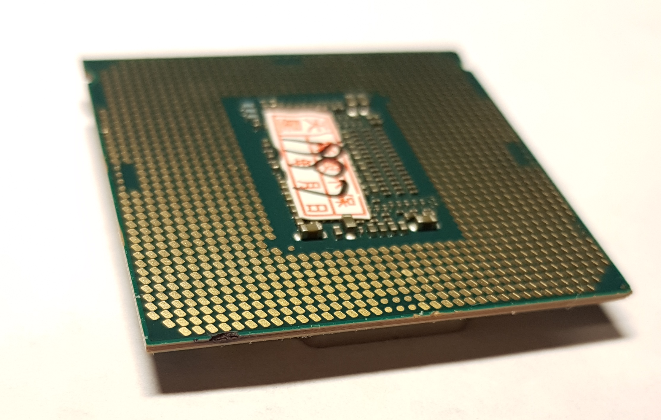 Скол был подкрашен черным маркером, видимо чтобы в глаза не бросалось - выяснил, когда контакты спиртом протирал. Но это скорее порадовало, так как изначально вообще показалось, что это прогар какой-то. Сам проц рабочий, по крайней мере заводится, более детально пока не тестил, но думаю ничего криминального.