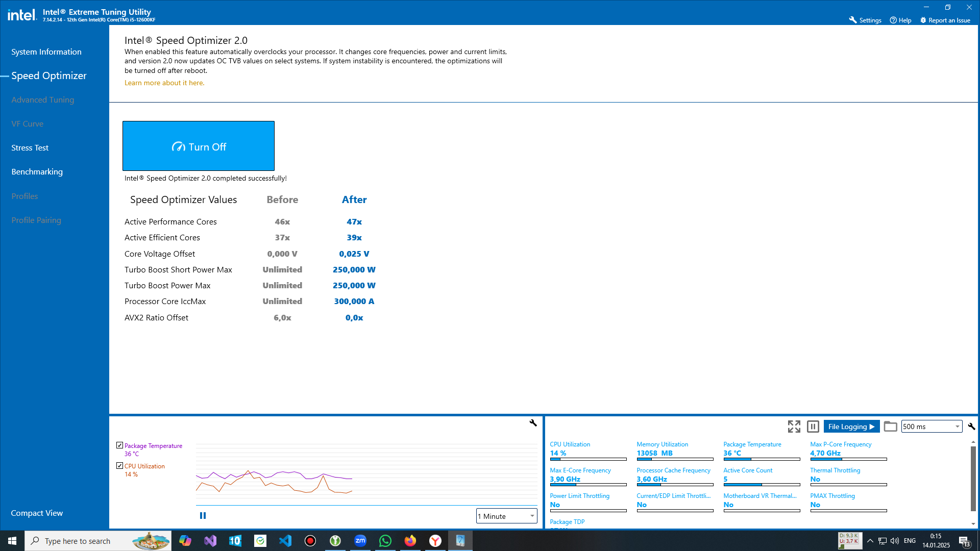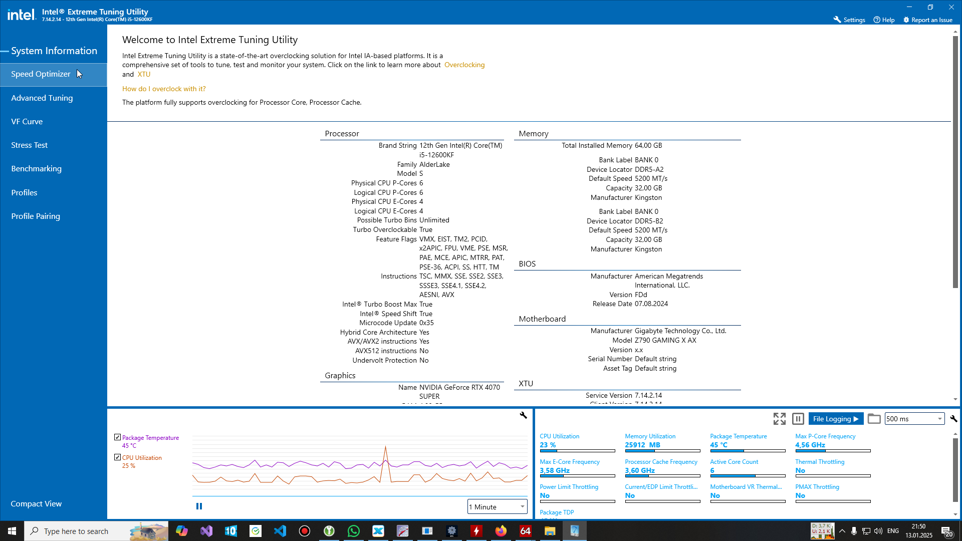 я так понимаю это авторазгон. утилита сама определяет есть ли вообще возможность разогнать проц и насколько. сама для этого делает все необходимые настройки и тестирует на стабильность. запускается она в виде службы винды и постоянно активна. я чуть выше скрин приложил. я бы забил,но уж очень комфортный фпс с этим разгоном. вся графика на ультрах+ретрейсинг на максимум без всякого длсс с его мылом. видяху не гнал. все по дефолту работает. и при этом ниже 60фпс в 2к разрешении не бывает. приложил скрин,для понимания какие именно параметры были до разгона и какие параметры Extreme Tuning Utility изменила,чтобы разогнать до 4,7 и P и Е ядрам. какие то лимиты, офсеты. не силен в этом. там же и набор тестов на стабильность. все тесты ок. никаких бсодов,зависаний. средняя температура не выше 60. СЖО однозначно справляется. в играх встроенные бенчмарки тоже ок. и при этом всем на следующий день BSODы на ровном месте. с нагрузкой или без нее. может вообще их не быть несколько дней подряд. нет закономерностей. коды ошибок все время разные