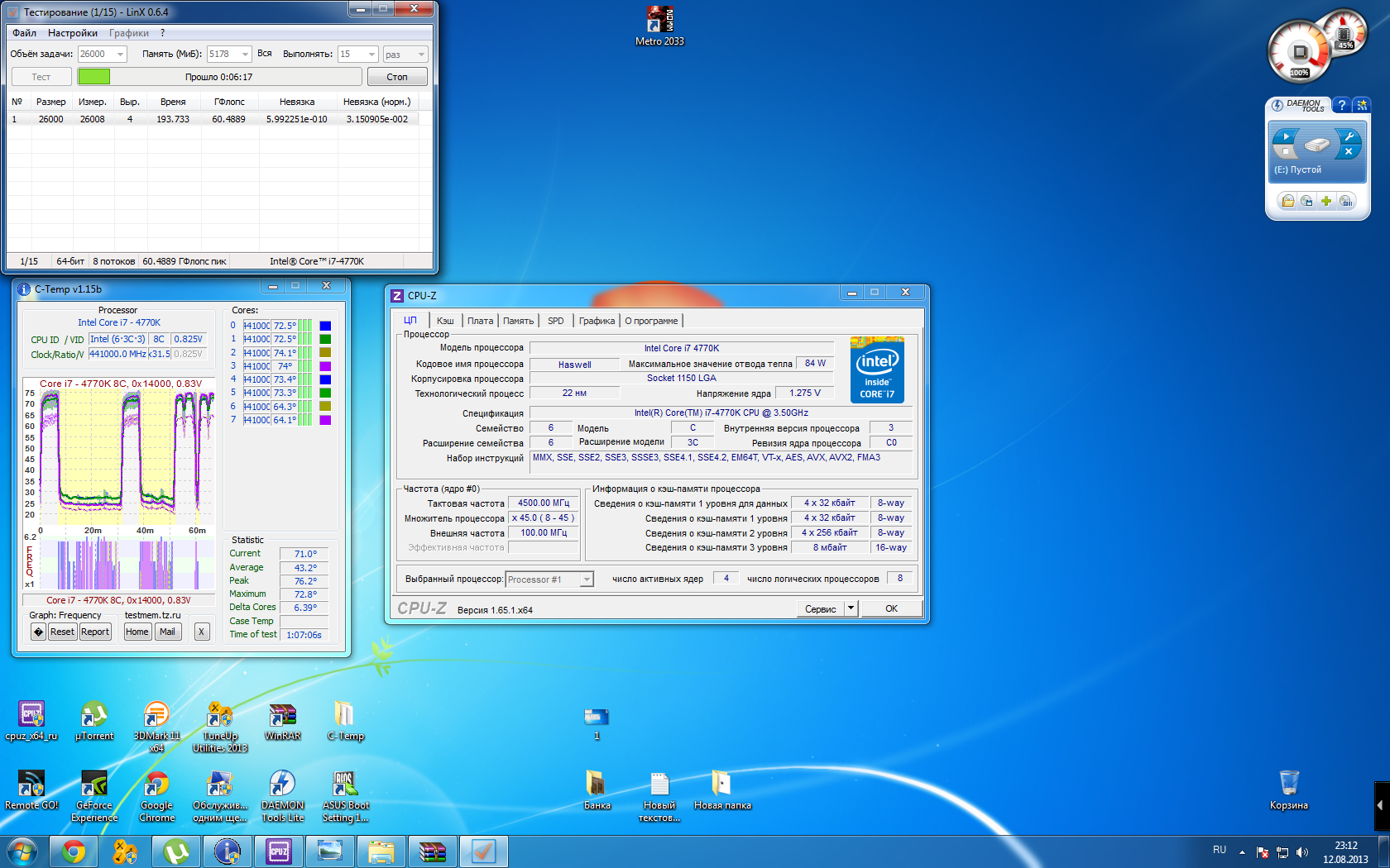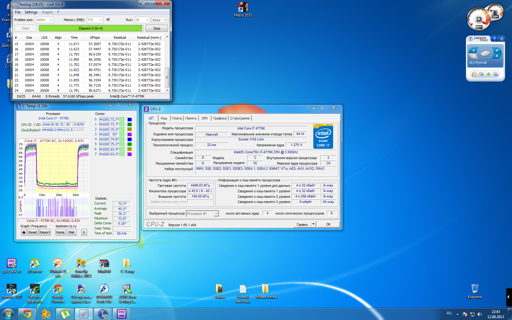 Доброго времени суток. Подскажите по разгону Intel core i7-4770k. Частоту поднял до 4500, напряжение 1.275, макс. температура в пике не превышала 77 градусов, это вообще нормально ? Раньше с разгоном камня дел не имел... Прикрепляю скрин