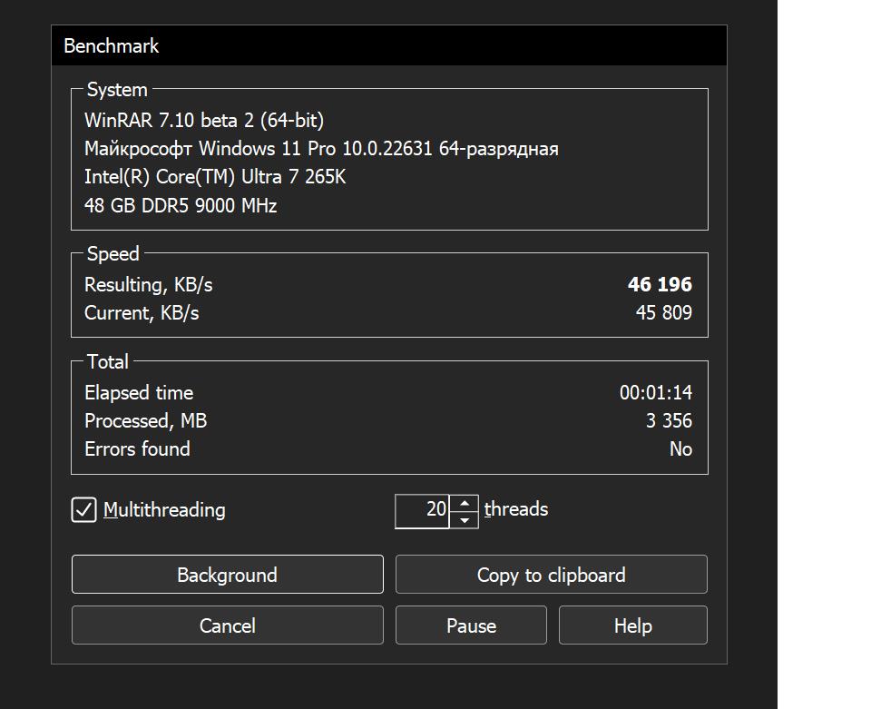 Alexey1977 приоритет реального времени винрару через диспетчер или в безопасном режиме с приоритетом в реальном времени затестить. Должны результаты выше быть. Вообще винрар на память хорошо отзывается может тайминг покрутить вторичка третички или частоту попробовать накинуть.