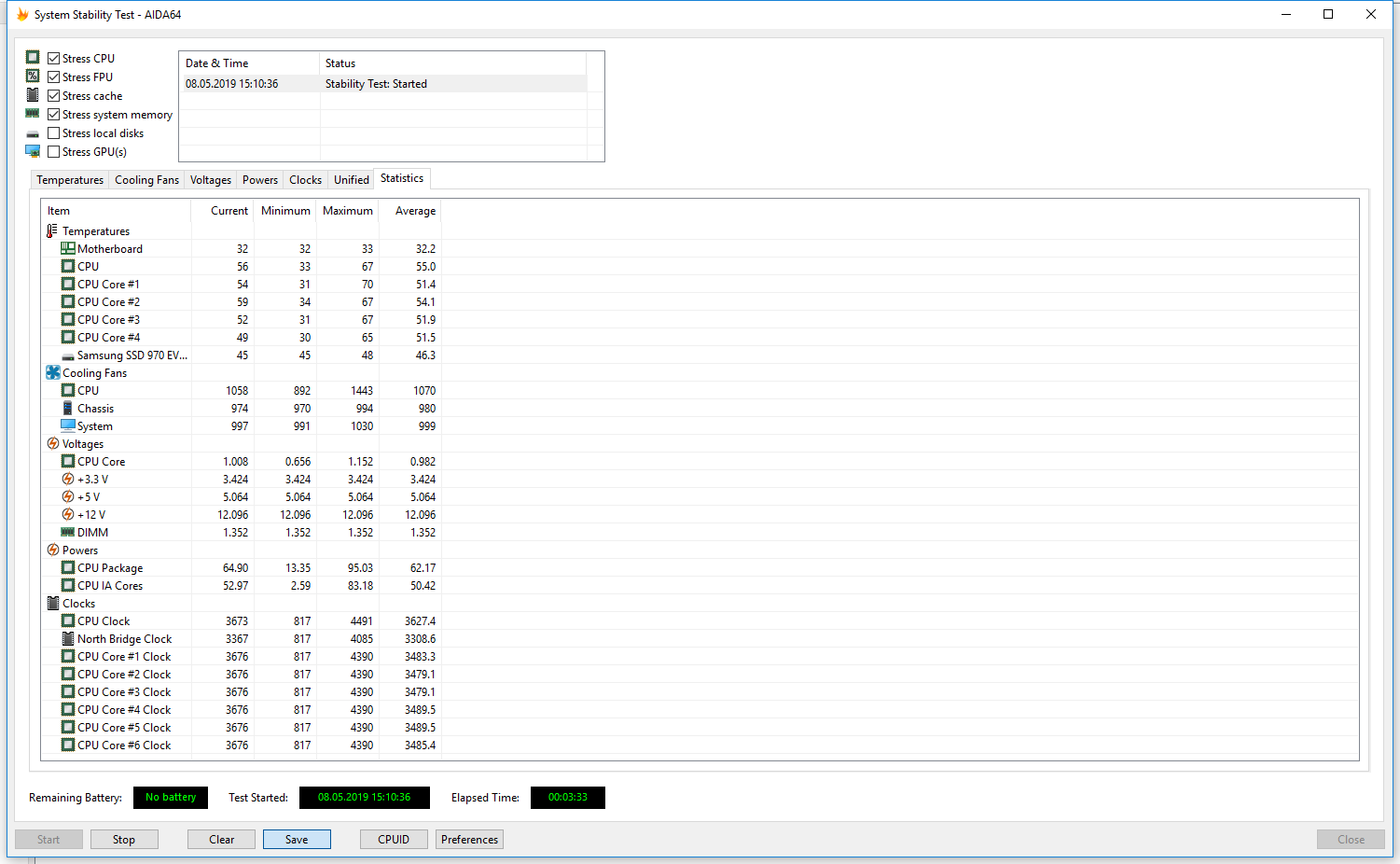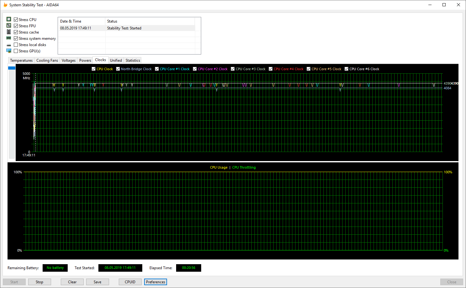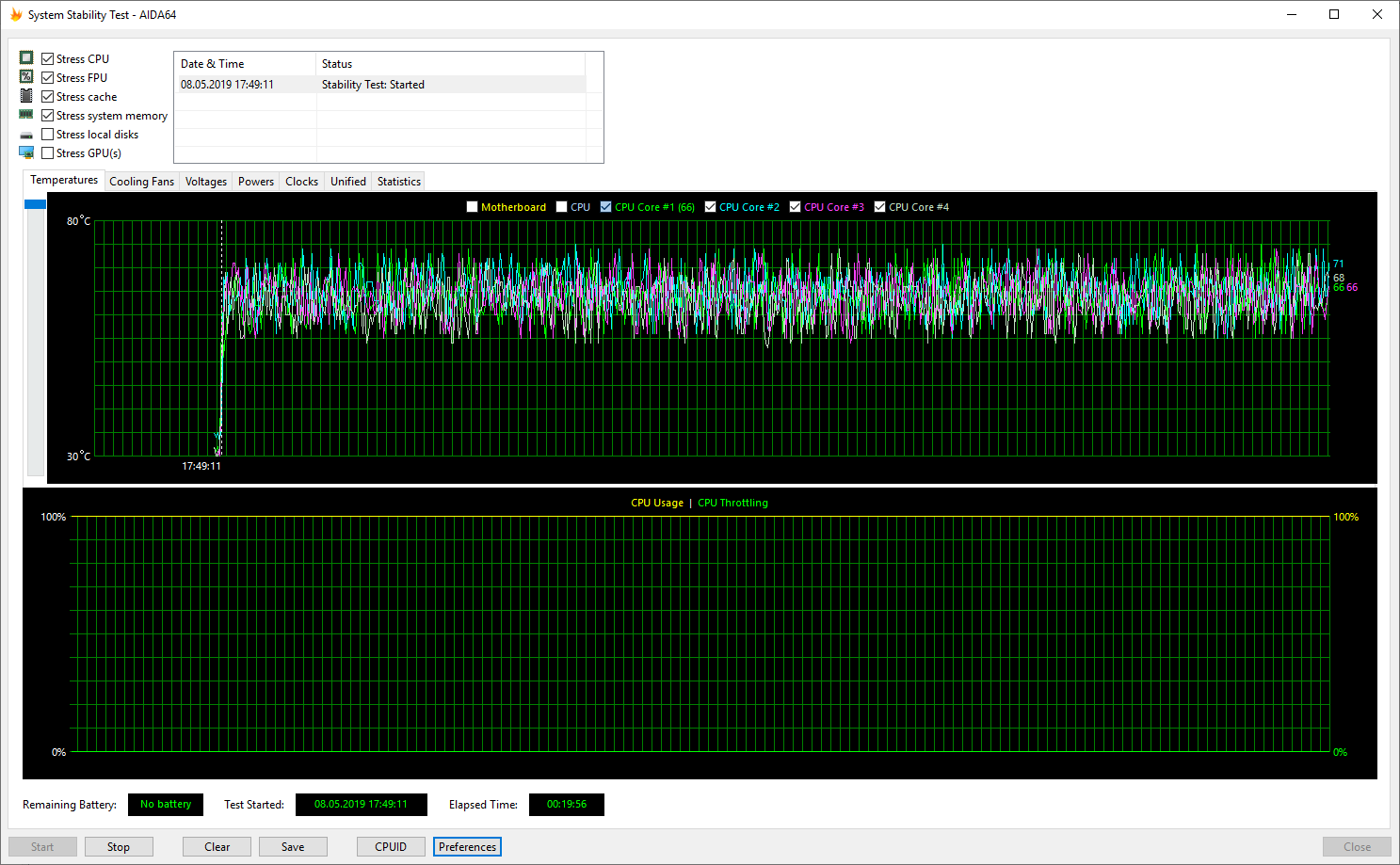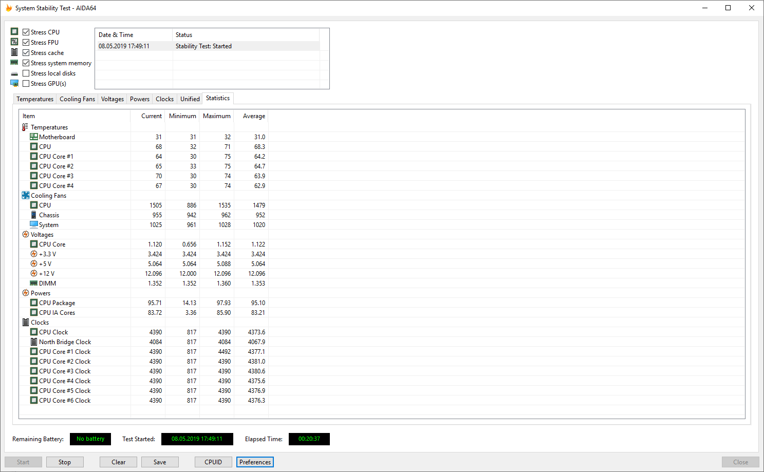 Собрал систему с i7-8700, проходил стресс тест в аиде, и в самом начала частоты доходят до 4300, но затем падают до 3700. При старте теста проц сразу разогревается до 65-70, вентилятор разгоняется, но затем падают частоты и температура проца до 50-55. Дальше весь тест стоит на 3700Гц. Из-за чего такое? Кулер GAMMAX 400, Мать Asrock Z390 Pro4, ничего в биосе не менял, только память по XMP настроил.