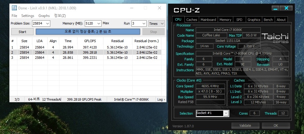 Полученный результат должен иметь следующий вид: Скриншот рабочего стола после прохождения >9 циклов (т.е. между 9 и 10 проходами). Вместе с LinX на рабочем столе должны быть развернуты CPU-Z (первая вкладка) и Core Temp, это обязательный минимум. Такой набор программ даст информацию о напряжении и температурах под нагрузкой-простоем. По желанию можете добавить другие программы, показывающие дополнительную информацию о вашей системе, например третью вкладку CPU-Z, которая покажет модель материнской платы и версию BIOS. Пример результата разгона: Mad Max, 5100 МГц (AVX 0), i7-8086K, HT-ON, Cache 4700, Vcore=1.36V, Batch L805E123, Gigabyte Z370 Aorus Gaming 7 (bios F6), Be Quiet! Dark Rock Pro 4, ЖМ под HS, Windows 10 Pro 64-bit 1809, LinX 0.9.3 64bit.