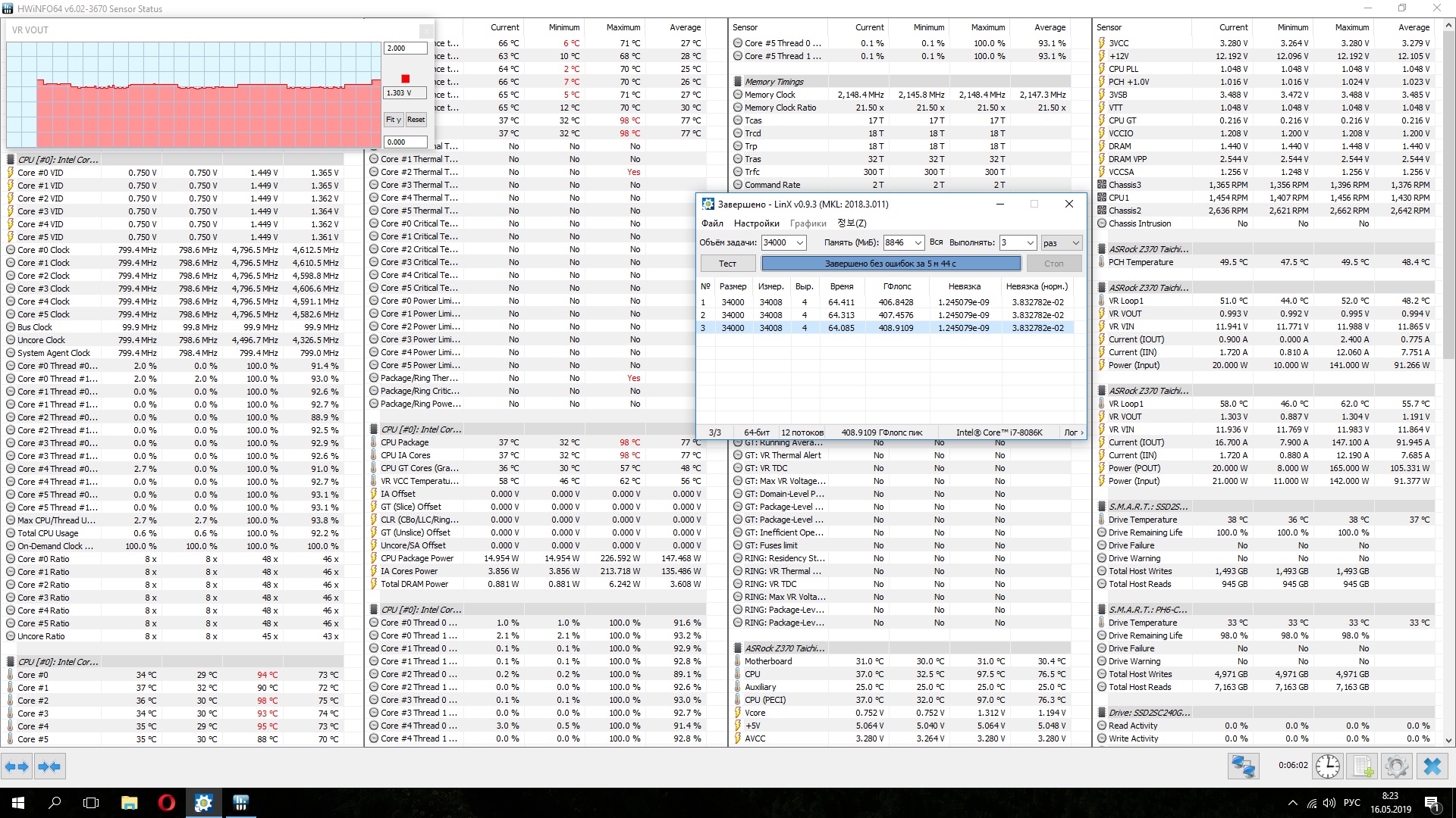 Полученный результат должен иметь следующий вид: Скриншот рабочего стола после прохождения >9 циклов (т.е. между 9 и 10 проходами). Вместе с LinX на рабочем столе должны быть развернуты CPU-Z (первая вкладка) и Core Temp, это обязательный минимум. Такой набор программ даст информацию о напряжении и температурах под нагрузкой-простоем. По желанию можете добавить другие программы, показывающие дополнительную информацию о вашей системе, например третью вкладку CPU-Z, которая покажет модель материнской платы и версию BIOS. Пример результата разгона: Mad Max, 5100 МГц (AVX 0), i7-8086K, HT-ON, Cache 4700, Vcore=1.36V, Batch L805E123, Gigabyte Z370 Aorus Gaming 7 (bios F6), Be Quiet! Dark Rock Pro 4, ЖМ под HS, Windows 10 Pro 64-bit 1809, LinX 0.9.3 64bit.