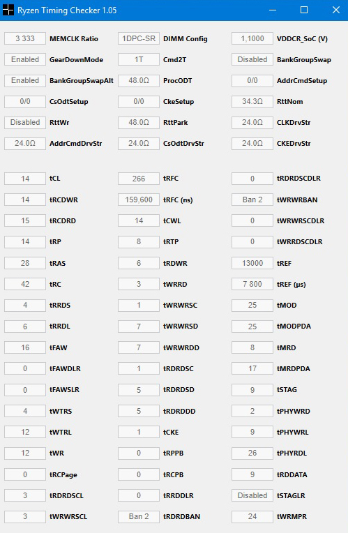 Корпус у меня вобщемто неплохо продувается,три вертушки на вдув и три на выдув,пока изменил один тайминг trcDRD на 15 погонял час игрушку, опять тест 5 циклов, прошел без ошибок,посмотрю как дальше будет,непойму только как сокс стабелизировать почему в Ryzen_Timing_Checker_1.05 постоянно разный показывает? или это норм