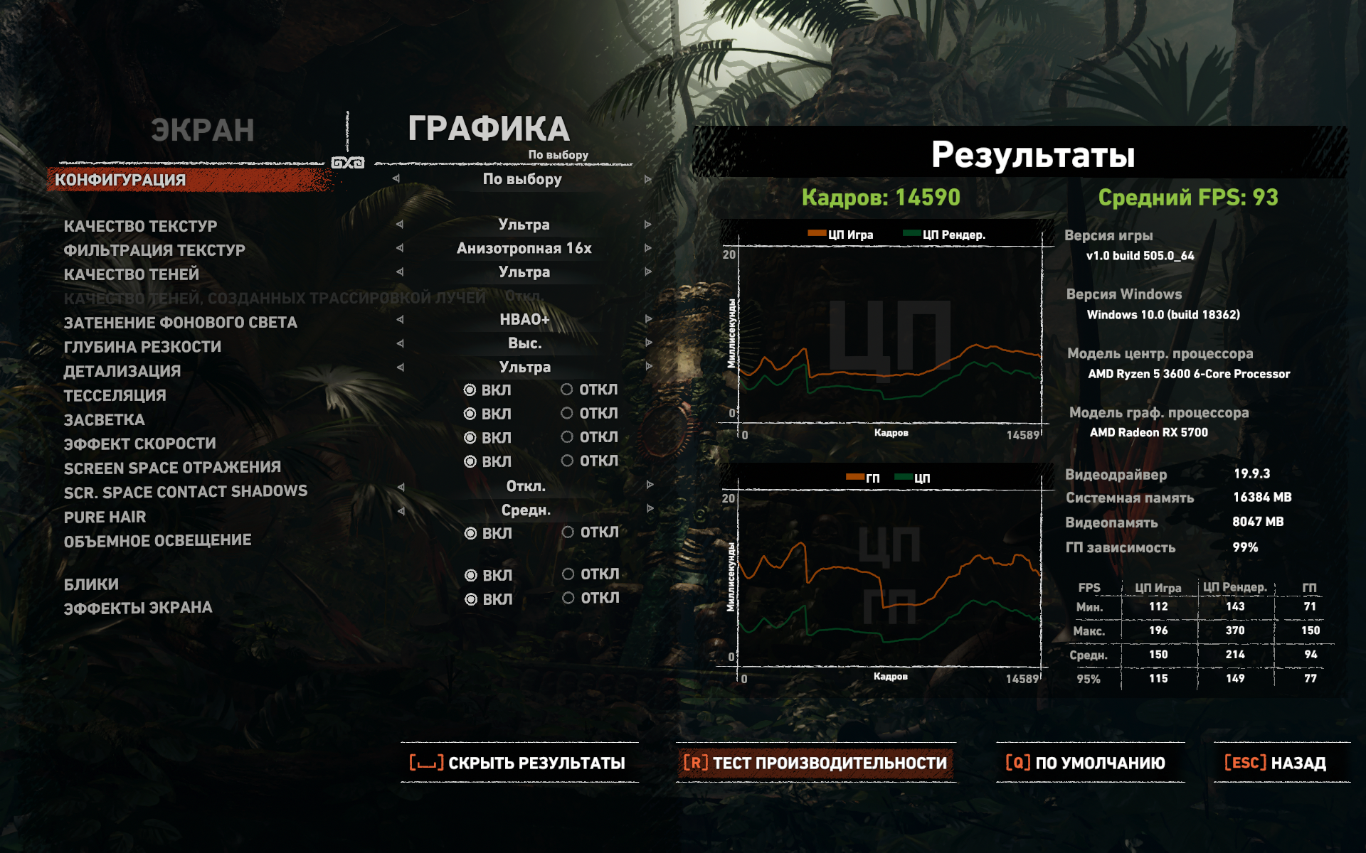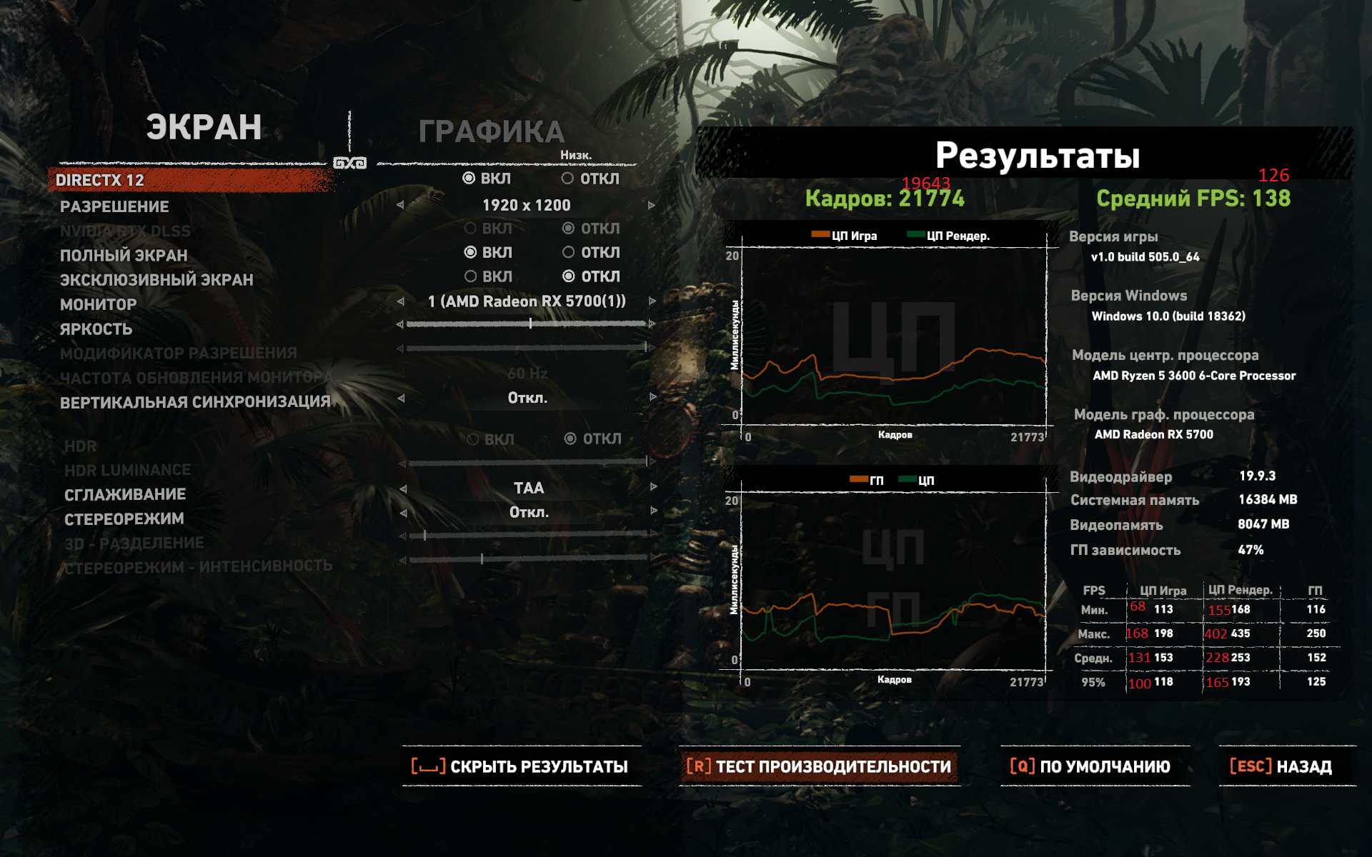 настройки графики низкие, чтобы не было упора в видеокарту, хотя хз, мож тут и неважно, ибо бенчмарк считает отдельно для проца и видеокарты. Результаты при ручном разгоне до 3600 С14, красным показан результат с включением заводского XMP профиля разгона 3200 С14. Если судить по первой колонке ЦП игра, то средний фпс вырос на 16%, максимальный на 17%, минимальный на 67%, что подтверждает теоретические данные о том, что главным образом ручным разгоном можно добиться существенного повышения минимального фпс