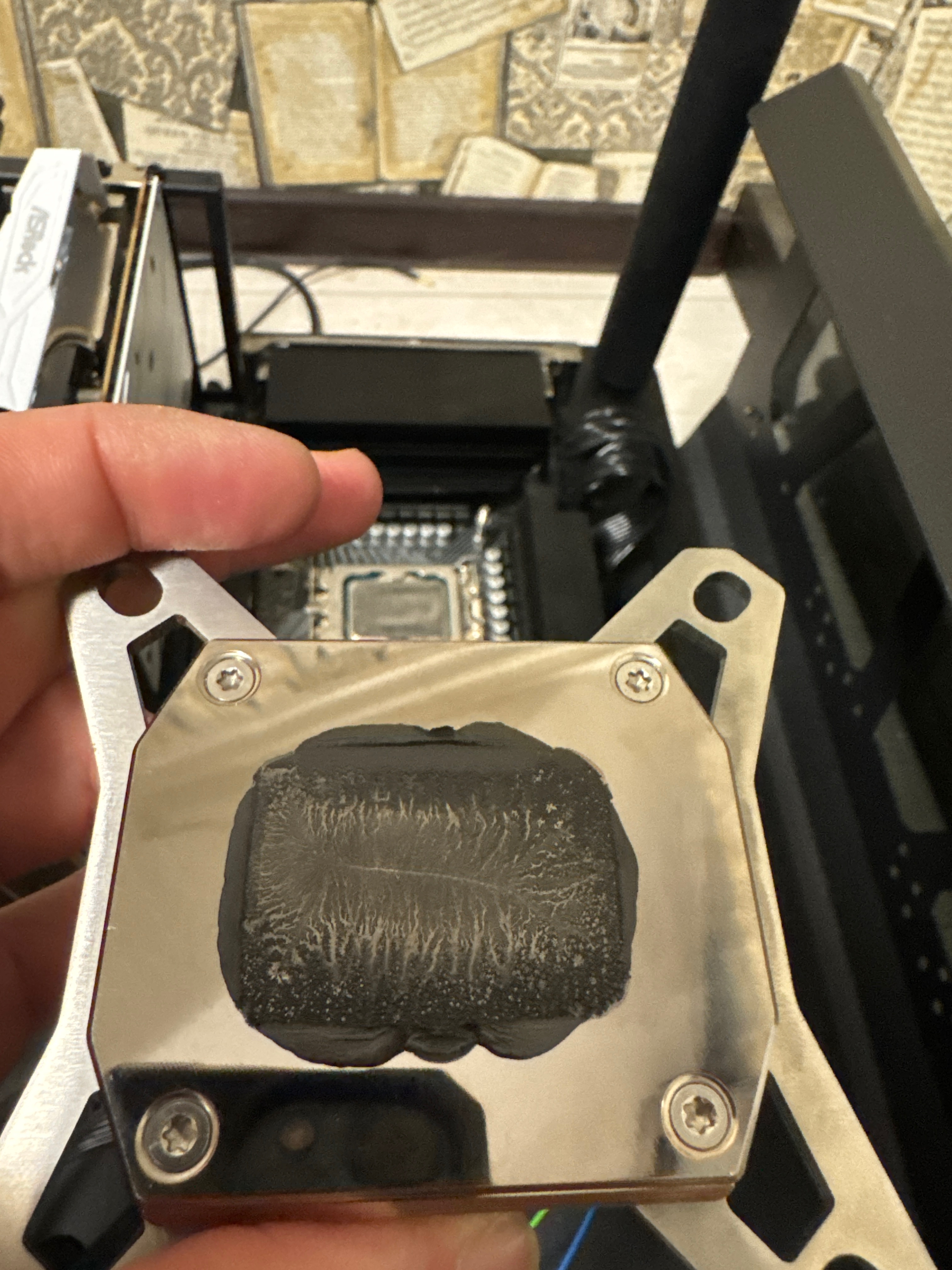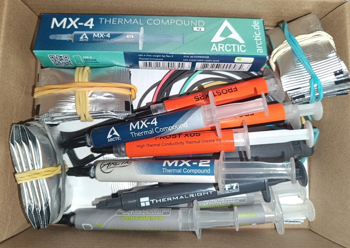 Хитромудрая импортозамещенная на графене, как-то попросили протестить. С тех пор остался стратегический запас, который непонятно куда девать. Хрень если честно, очень трудно размазывается, при этом жутко пачкается и обладает термопластичными свойствами, чего от термопасты меньше всего ждешь. Но, как оказалось, для проверки отпечатков самое то. Там их два варианта, с большим и маленьким содержанием графена, по факту оказалось что худшая по замыслу паста на самом деле лучше более «крутой», которая полная хрень. Всё как всегда.
