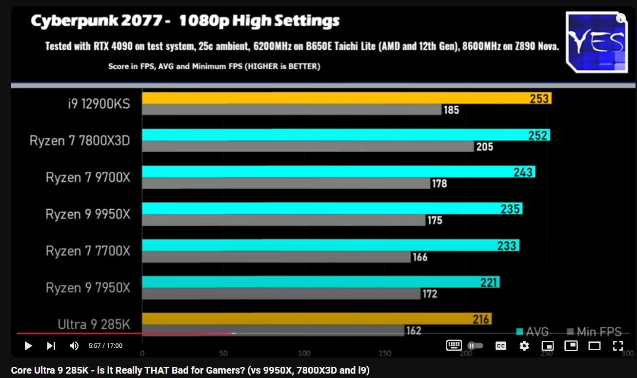 Ключевые подробности из видео: • Процессор просто катастрофически показал себя в Cyberpunk 2077: процессор предыдущего поколения в лице 14900K опередил его на 45%, а 12900 - на 28%. 7800X3D в ряде случаев обгонял 285K в игре и вовсе на 60%; • Baldur's Gate 3: 285K отстал от 7800X3D примерно на 15-20%, а от 14900K - на 10%. • Microsoft Flight Simulator 2020 стала еще одним провалом 285K: отставание процессора от 7800X3D составило 25%, а от 14900K - 15%; • В Dragon's Dogma 2 285K отстал примерно на 5% от 7800X3D и незначительно уступил 14900K; • Из всех тестируемых игр, лишь в Starfield 285K удалось обойти конкурентов: процессор опередил 7800X3D в среднем на 8%, однако преимущество над 14900K оказалось совсем минимальным.