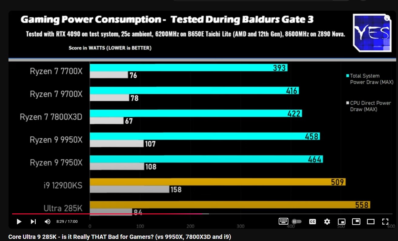 По итогу единственный проц от Интел который он рекомендует к приобретению - это 12900k, потому что камни новее у него похоже деграднули и крашились, поэтому их в тестах нет. Ну а полное потребление системы в играх с 285к даже больше чем у 12900KS, не говоря уже о райзенах.