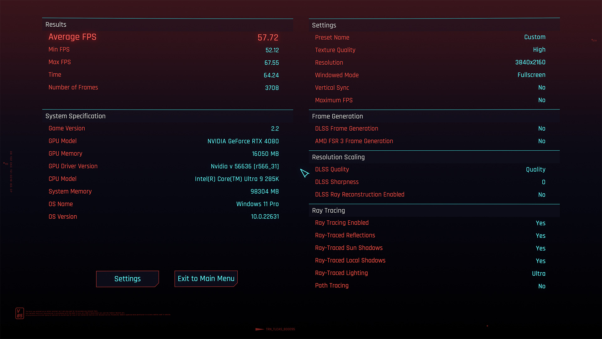 Настройки полный максимум с максимальными лучами(трассировка пути), разрешение 1280x720, DLSS ульрапроизводительность. Лучи намного сильнее грузят проц.