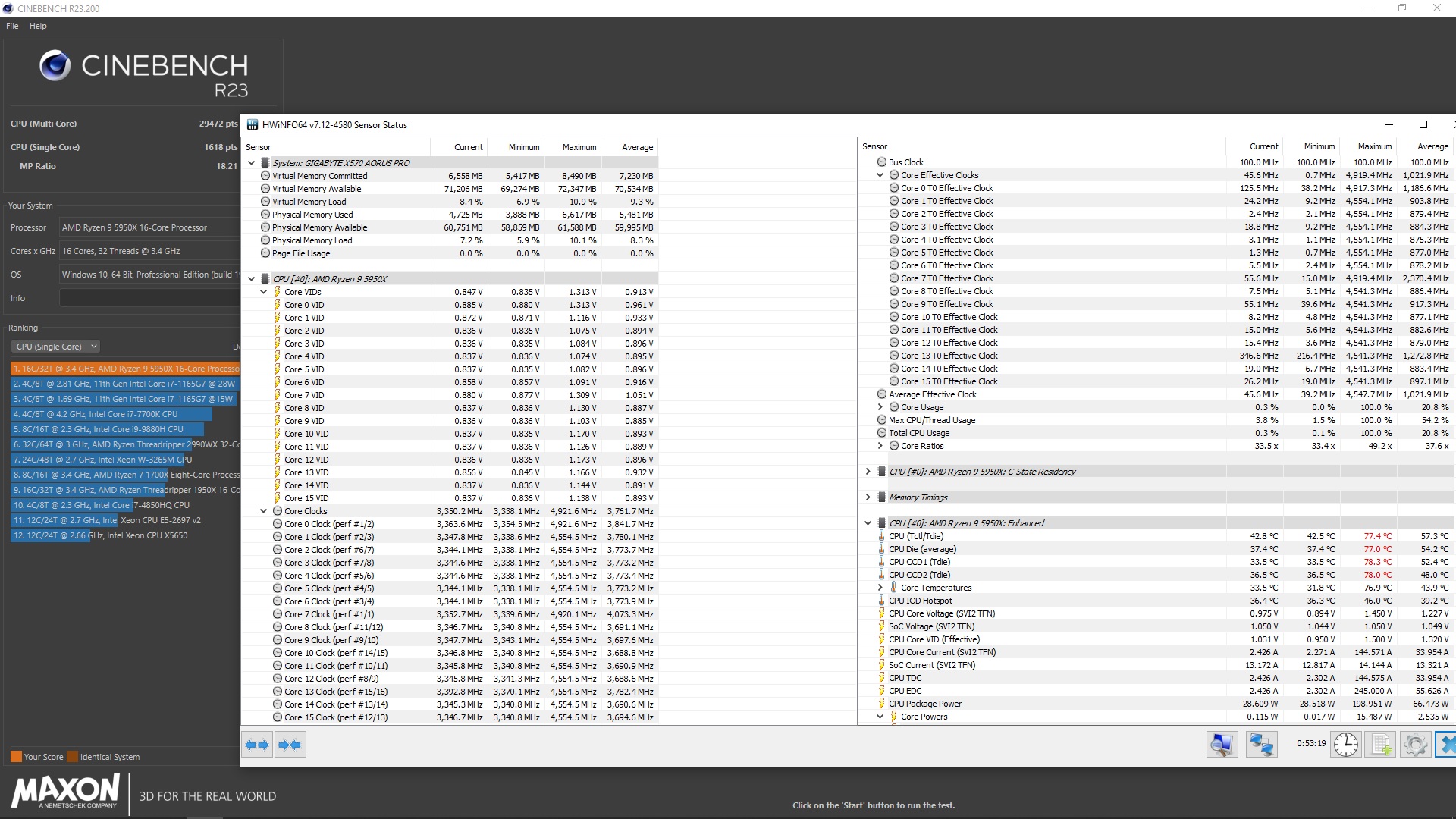 По предыдущему опыту общения я понял что на тишину тут в принципе всем плевать, главное выпендрится результатом бенча. По этому скину вам ещё скрин PBO(2), 200W, fullspeed, 77C (limit). 77 разумеется не предел и теперь этот корпус может и больше, но я не хочу ставить больше, даже для тестов. По этому вот так выходит в CineBench 23: multicore 29472, single 1618.