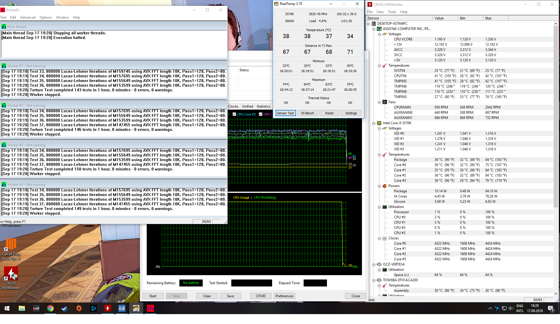 Alltuir prime, режим small set - этим достаточно пару часов (проверка стабильности процессора), даже наверное и 1 часа хватит, режим blend (комплексная проверка системы, не считая видео) - а вот тут надо долго гонять, часа 4 хотя бы. а дальше уже как раз пойдёт самое нудное - проверка в реальных задачах. и длиться этот процесс может дооолго, комп может сбойнуть в самом, казалось бы, неожиданном месте. вроде всё было хорошо, месяцами хорошо, а тут новую программу/игру поставил и началось. это как пример... образцы скринов показывали, снимать их надо во время теста, а не когда уже всё кончилось. с другой стороны, если два дня обильно играл без проблем - это уже немало значит...