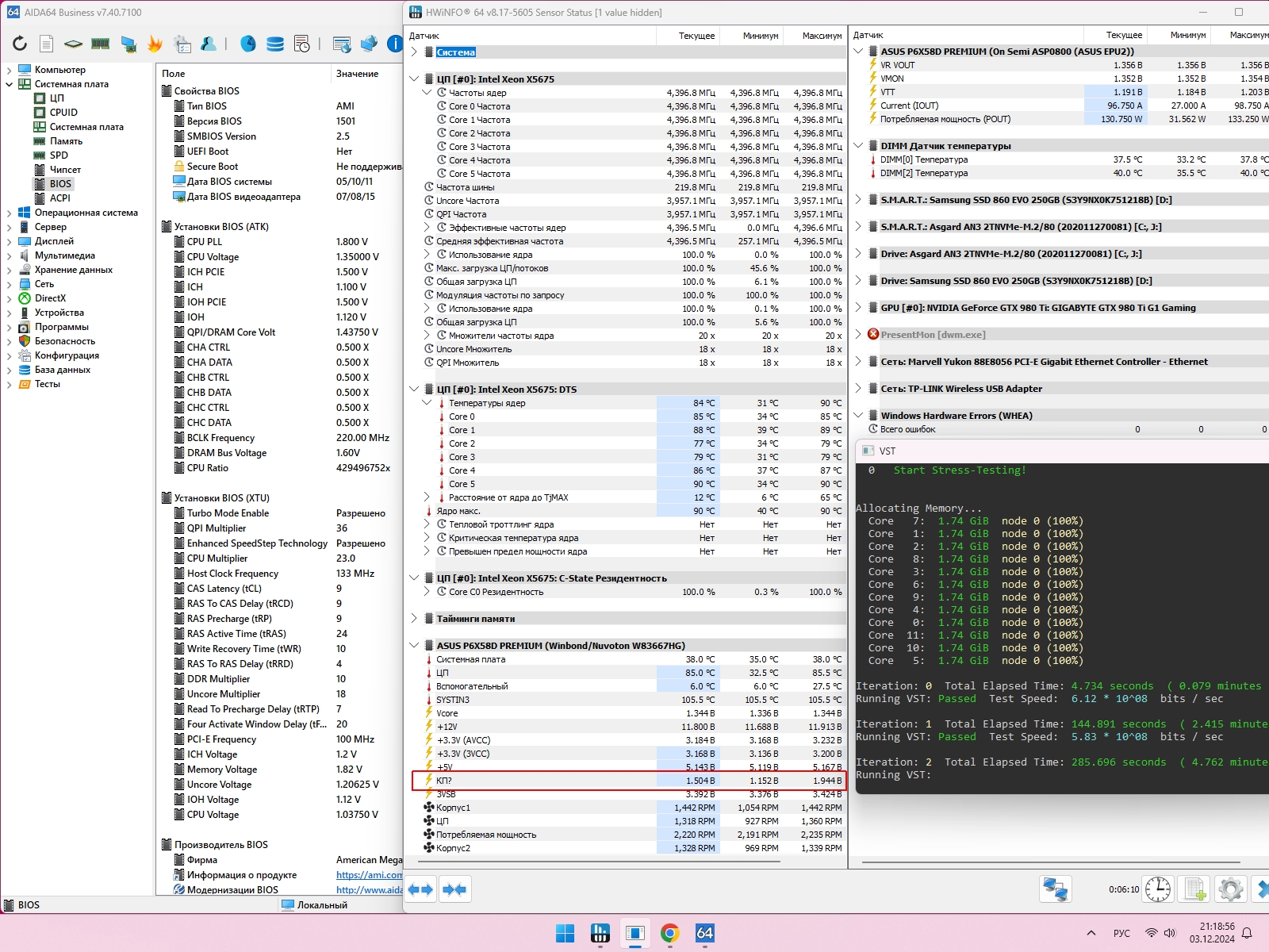 BOBKOC, ну память-то от нехватки частоты не страдает, остановился на комфортной мне частоте памяти 2160 (родная 1600). У меня на обоих процах минимальные требования к uncore = 1.5 от эфф частоты памяти. Просто я когда 5690 брал, то думал у нее и uncore должна летать, а не только основная частота (ведь зеоны-то явно отбирали более пристрастно, чем десктопники того же уроня). Плюс очень странное проявление нестабильности. Если на 980 при нестабильности просто выкидывало синий экран, то на зеоне он аж до 4000 Uncore спокойно запускается, после показа синего экрана прибавляешь напряжения допустим с 1.3 до 1.34 и он стабильно адекватно работает. Но после 15 минут прожарки бац и завис. Причем время зависания что на 3800, что на 4000 частоте uncore - плюс минус одинаковое. Это вообще нормально, что вместо синего экрана такая шняга?
