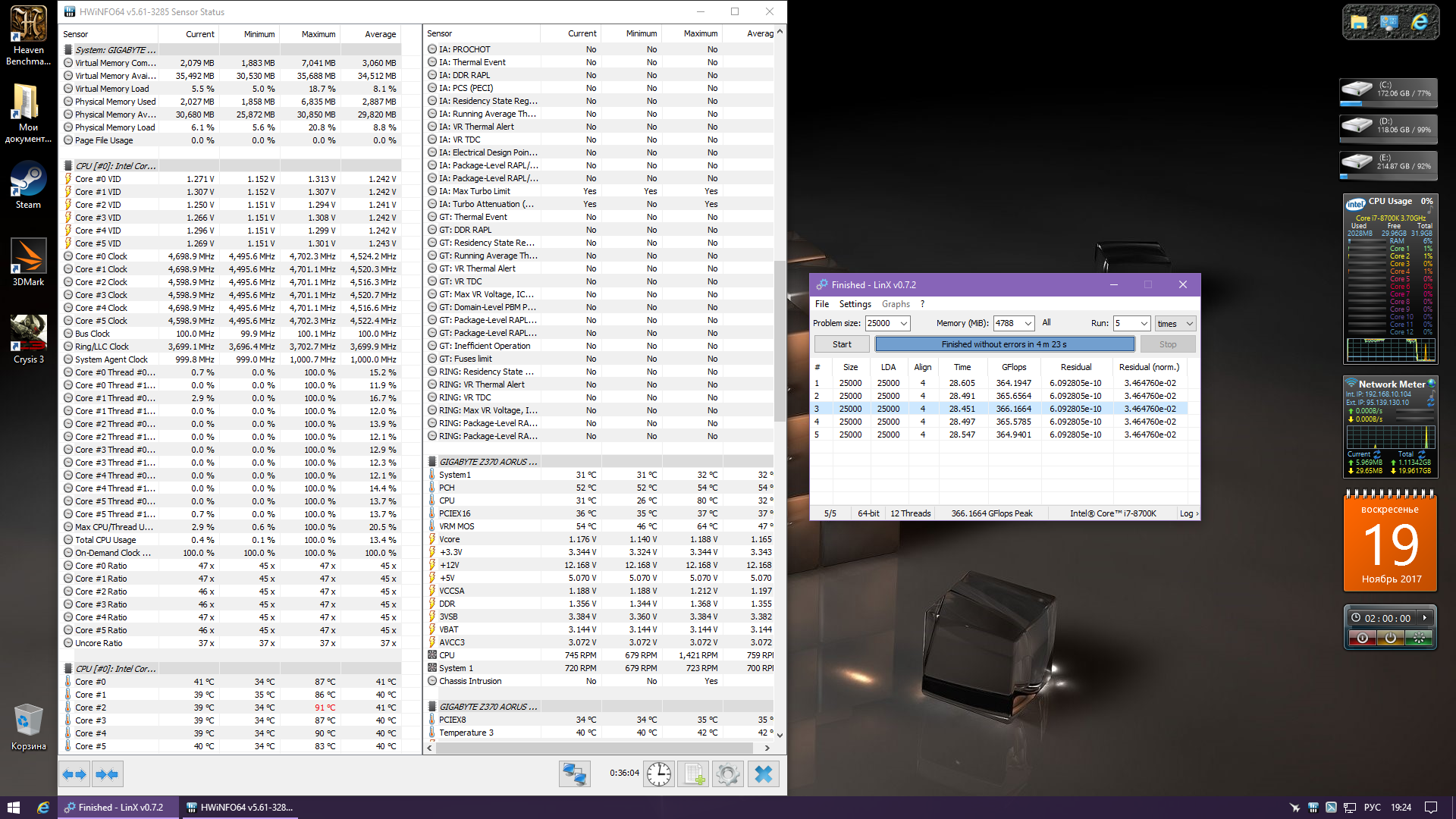 Час Prime95 v29.3 no AVX 5.2@1.43v. В RealBench при таком напряжении 5.2(5 AVX) макс. температура 92С. Я не знаю как тестируют процы типа 5.3@1.3v, но это только подтверждает обзоры и статистику отбора камней на https://siliconlottery.com/collections/coffeelake/intel-i7-8700k