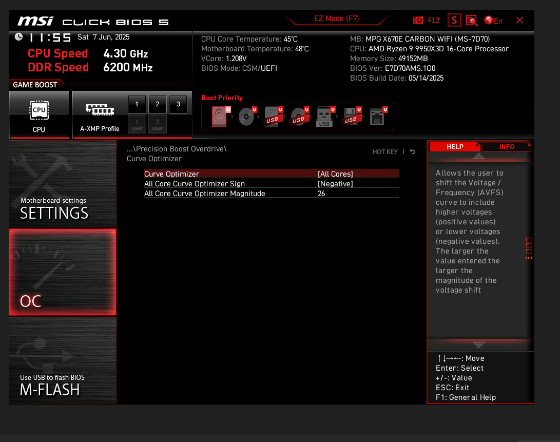 Здравствуйте, тестировал свой новый процессор ryzen 9950x3d с курвой -30,, в тестах TМ5 anta777 3D y-cruncher по 1,5 часа, гонял разные бенчи и игры все работало стабильно и без ошибок, был уверен что процессор работает стабильно. По совету белоруС_80 решил прожарить процессор в стрестесте AIDA64, при курве -30 тест остановился с ошибкой через полторы минуты, при курве -28 тест без ошибки прошел 16 минут, при курве -26 тест отпахал все 1.5 часа без ошибки как хотел. Пока оставлю так.