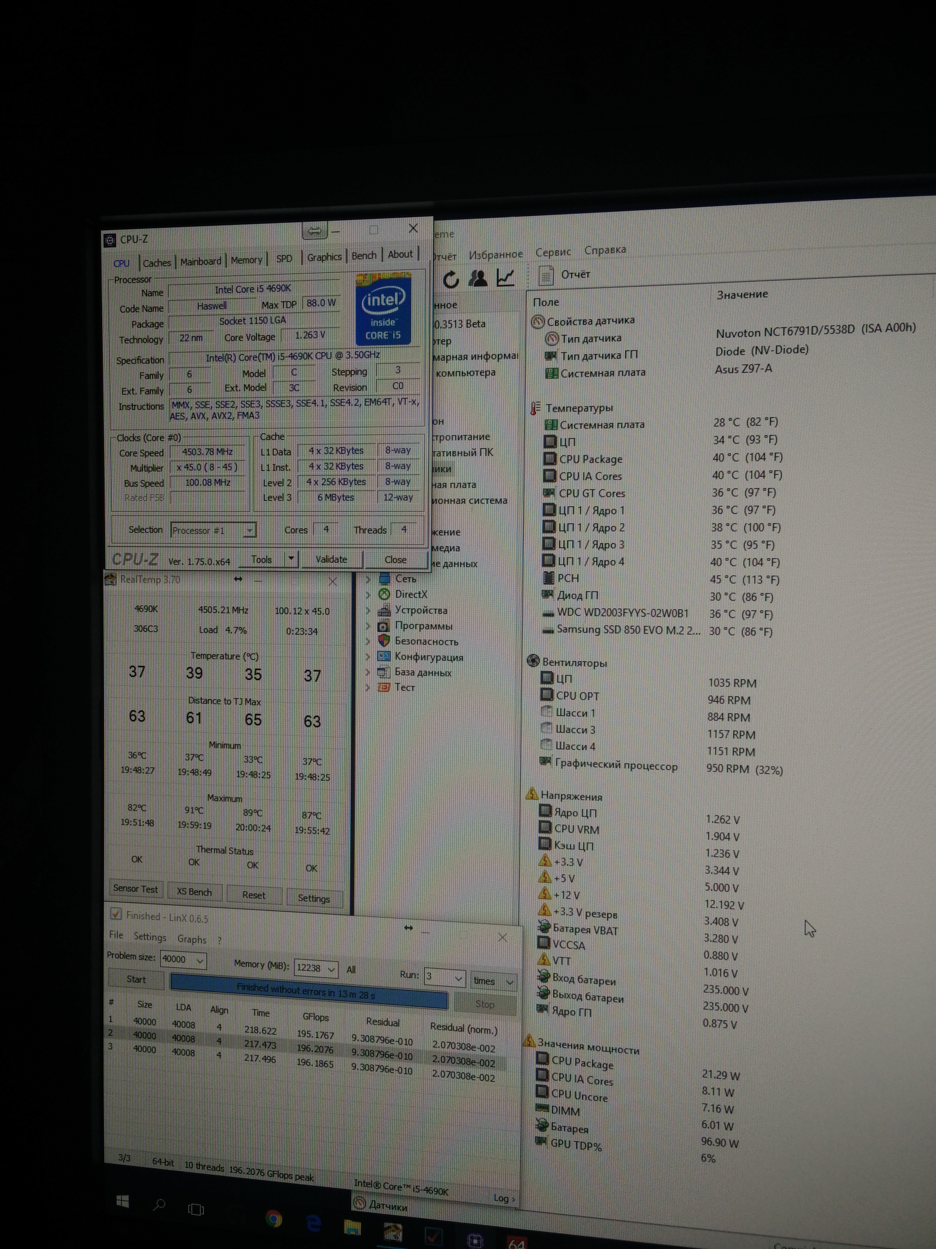 Сегодня решил поэкспериментировать с проц... Получил 4503МГц, i5-4690K, Vcore=1.263V, VRIN=1.890V, крышка не снималась, VID 1.008V, охлаждение - xspc raystorm 750 ex240 -MX-4, asus Z97-A, bios 2601, LinX 0.6.5 64bit (40000) При 14000 размера проходит на меньшем напряжении (1.250 проходил) До этого был 4.303ghz при 1.190v Вот так... Думаю хороший результат... Учитывая что 40к операции...