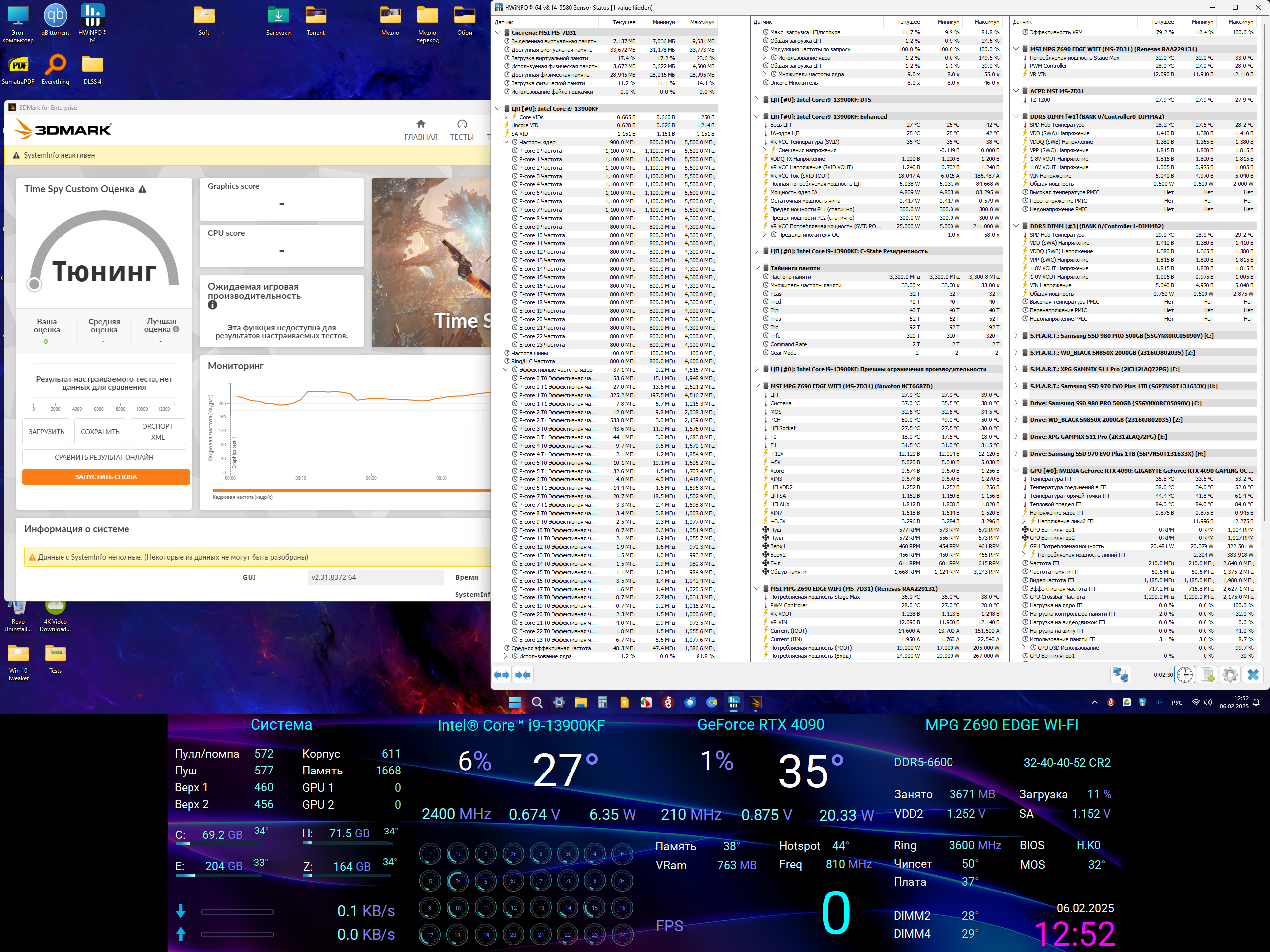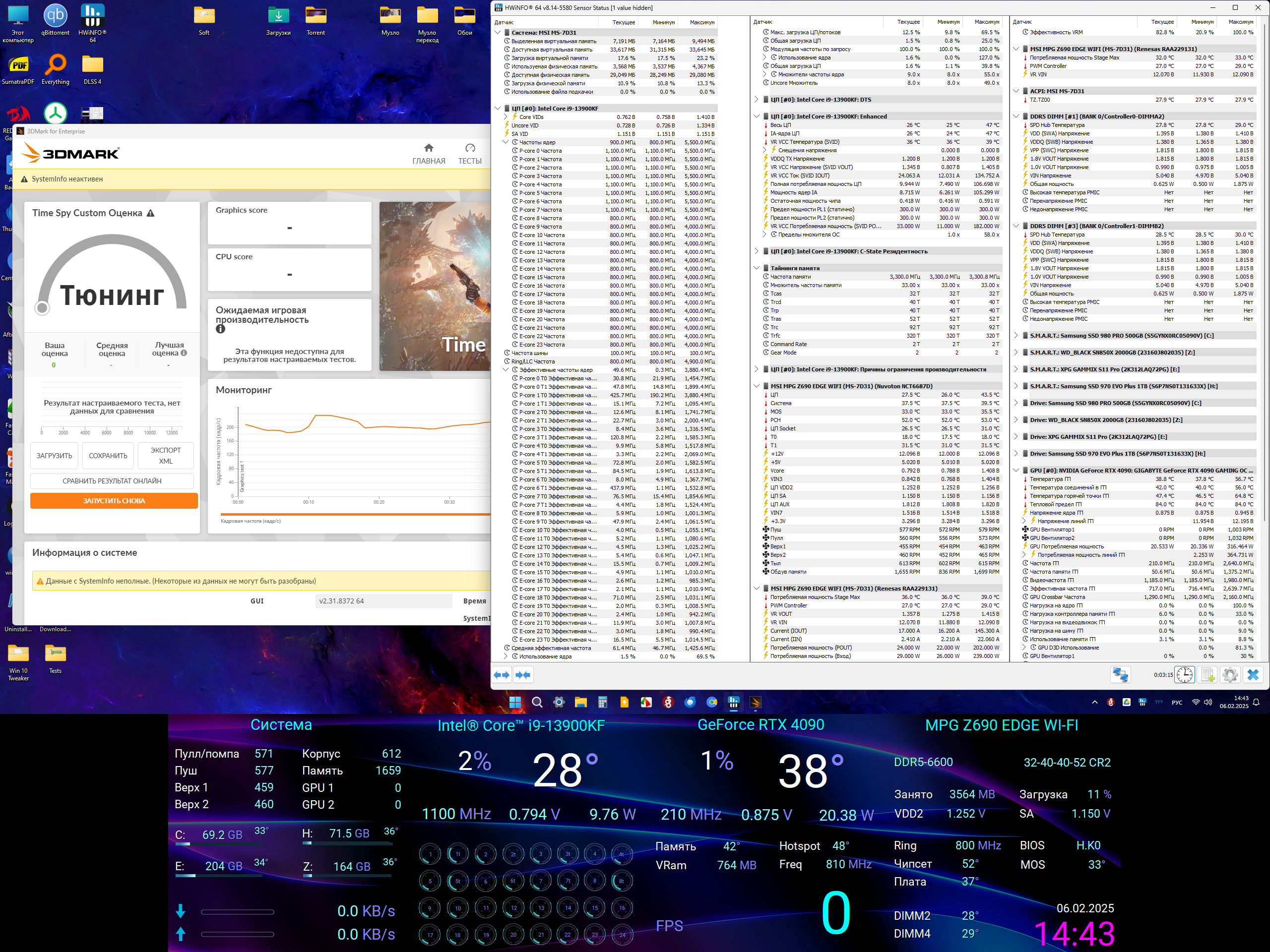 Вот провёл наглядный тест отличия «прямого» LLC и режима минимальной компенсации. В сильной нагрузке (не максимальной) и в средней типа игр. Сильную нагрузку делал в аиде FPU, она постоянная без переключений. Игрушек сейчас у меня нет, так что средняя нагрузка, типа имитация игры- Тайм спай 1440p, в настройках проход только первого теста, он более-менее равномерно грузит проц на всей дистанции. Все TVB выкл. Одно-двухъядерные бусты отключены для чистоты показаний напряжений. Скрины аиды делал в момент нагрузки, тайм спай уже по результату. Было несколько прогонов, скрины специально не отбирал, они очень похожи, погрешность минимальна.