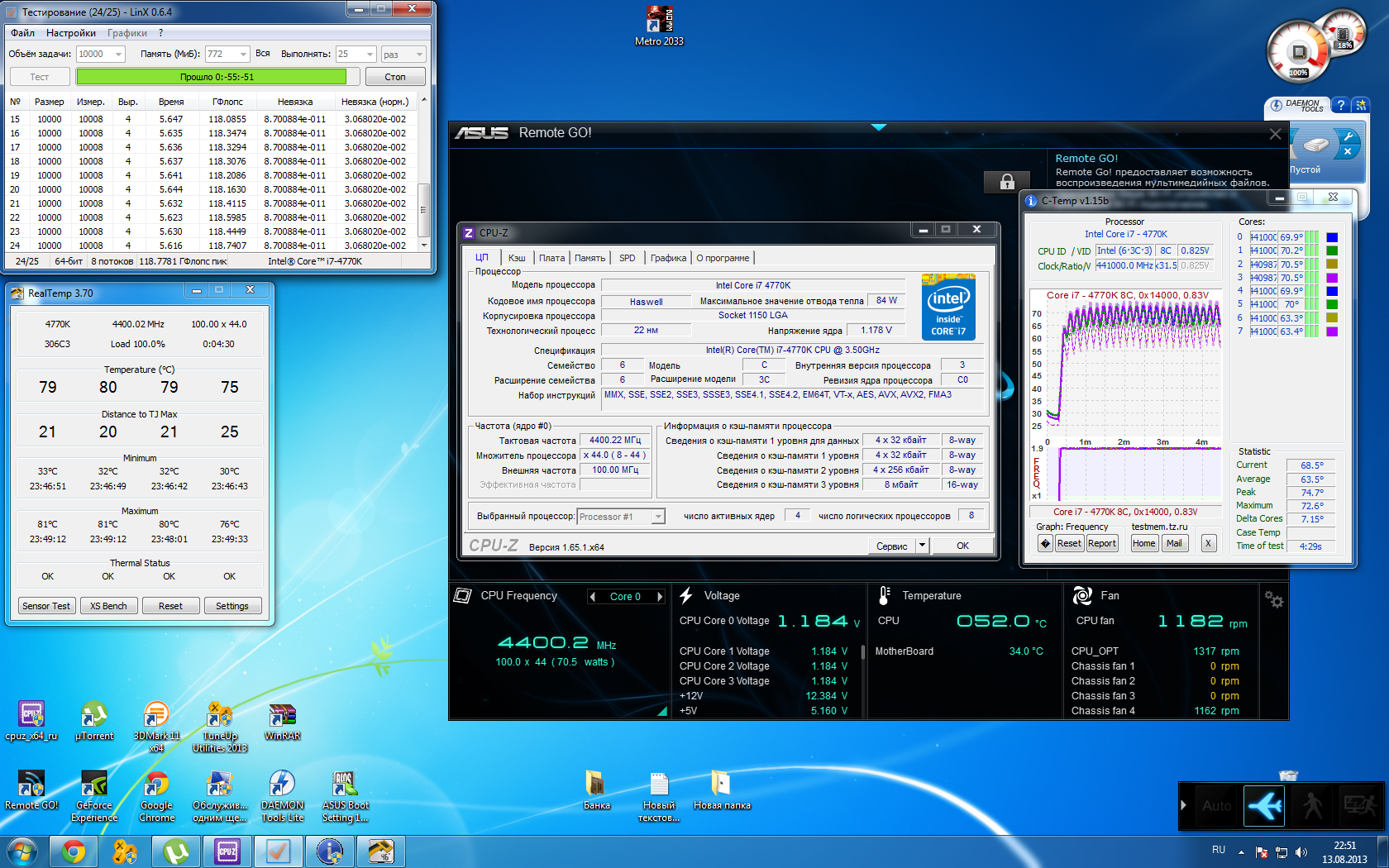 Тестил на Linx AVX в двух режимах на 10000 и 26000 объём задачи по 25 раз, в итоге 4400Мгц, напряг ваставил вручную на 1.180V, вроде всё стабильно, скрины прилагаю... Как вам, более опытным в этом воопросе, данные результаты ? Подскажите имеет ли смысл гнать дальше, или ещё чем нибудь потестить потежелее и подольше ?
