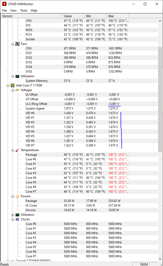 Напруга прыгала аж до 1,675, несмотря на оффсет -0,08. Это вообще как материнка руководит питанием, какой функцией это настраивается (кратковременное повышение напруги)? VCORE максимум 1,578. Монитор запущен уже после начала рендера, и минимальные частоты в 800 по ядрам - проскакивали в процессе рендера. Т.е. нагрузка по отдельным ядрам периодически пропадала - но не вижу ничего выдающегося, ну не всегда видимо в потоке были сложные расчеты. Но интересный факт. Большую часть времени частоты были 4600..4800, иногда видел и 4200, и 5000. Мощность держалась 220..240 Вт. Напруга большую часть времени скакала в районе 1,3 +-0,05 В.
