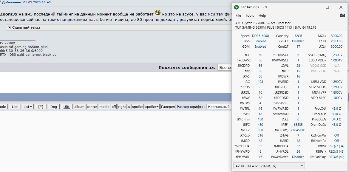 Zoom3x на ам5 последний тайминг на данный момент вообще не работает но это на асусе, у вас мси там фиг знает… есть пара нюансов общих для дд5 (вот если там накосячить то не стартанет) остановился сейчас на таких напряжениях на, в бенче тишина, до 80 проц не доходит, результат нормальный, если брать верхний результат то там проц грелся до 84.5