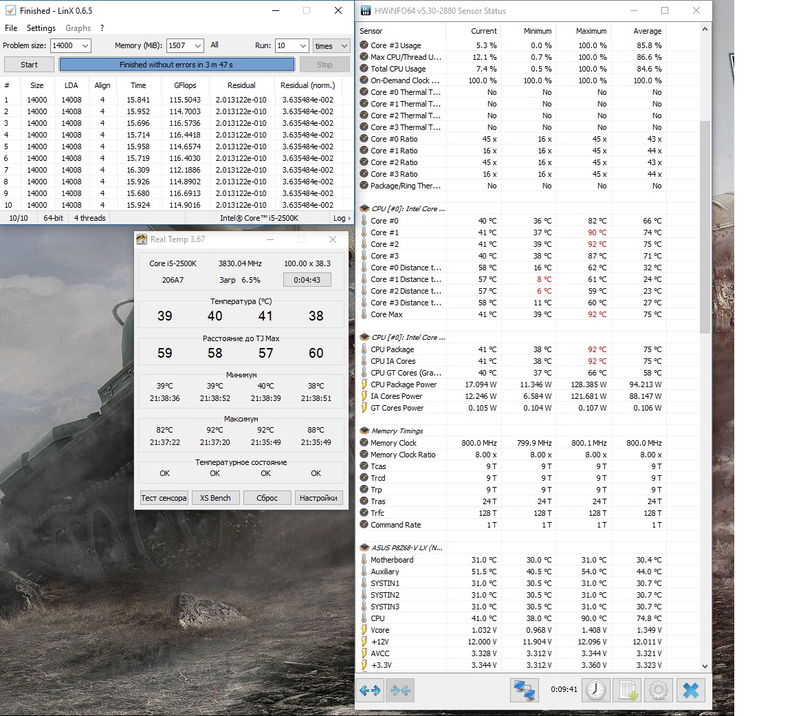 Привет всем. Тоже мучаюсь с разгоном своего 2500К . До этого стабильно работал на частоте 4.2GHz , но после покупки GTX 1070 решил разогнать до 4500+ . Второй день мучаюсь, выше 4.3 не идет, начиная с 4.4 LinX 0.6.5 AVX после 4- 5 го прохода либо ошибка, либо "бсодит" , Vcore уже до 1.362 доходит ( по БИОС 1.310) дальше как то страшновато. С Охлаждением все впорядке, макс 71C при том же Линпаке самое горячее ядро. Может кто имел дело с этой мат. платой ASUS Z68 VL-X , понимаю ,что не фонтан,но сейчас достать мат. плату под Сандаль проблематично.