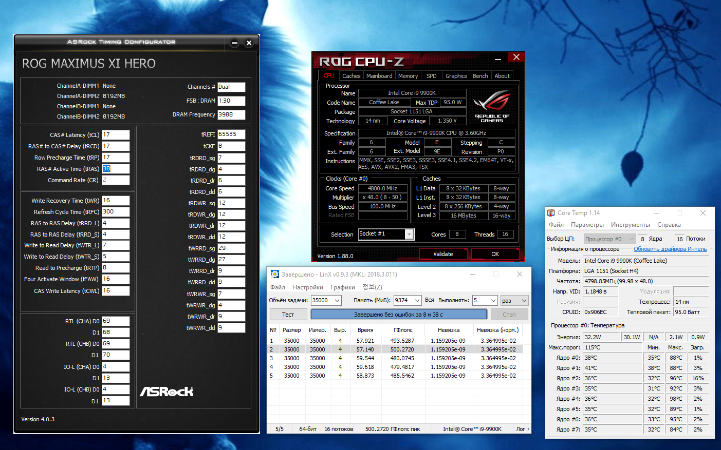 Полученный результат должен иметь следующий вид: Скриншот рабочего стола после прохождения >9 циклов (т.е. между 9 и 10 проходами). Вместе с LinX на рабочем столе должны быть развернуты CPU-Z (первая вкладка) и Core Temp, это обязательный минимум. Такой набор программ даст информацию о напряжении и температурах под нагрузкой-простоем. По желанию можете добавить другие программы, показывающие дополнительную информацию о вашей системе, например третью вкладку CPU-Z, которая покажет модель материнской платы и версию BIOS. Пример результата разгона: Mad Max, 5100 МГц (AVX 0), i7-8086K, HT-ON, Cache 4700, Vcore=1.36V, Batch L805E123, Gigabyte Z370 Aorus Gaming 7 (bios F6), Be Quiet! Dark Rock Pro 4, ЖМ под HS, Windows 10 Pro 64-bit 1809, LinX 0.9.3 64bit.