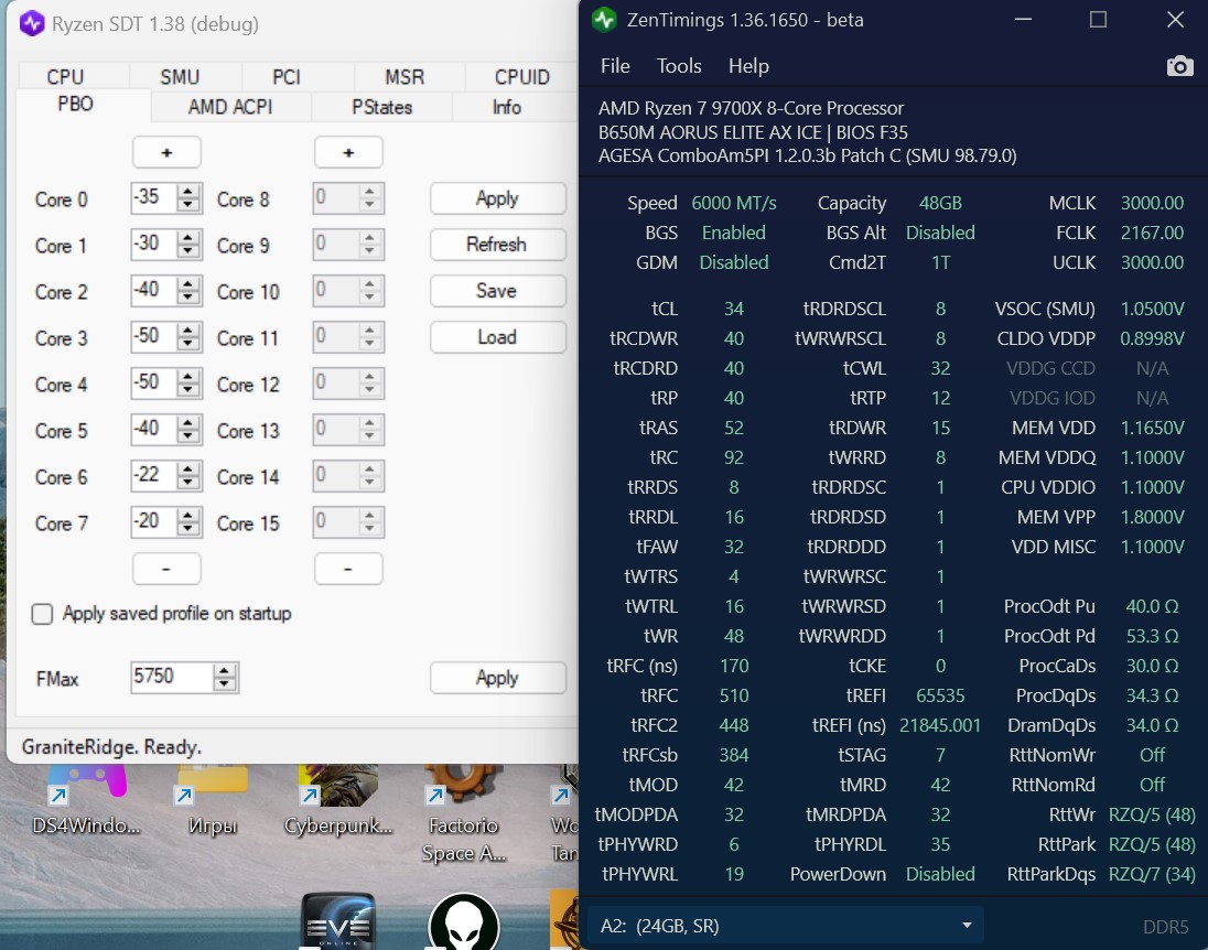 Много где читал и слышал, что чуть ли не все 9800X3D берут -30. У меня стабильны только -20, проверял Аидой. Конечно в кучу игр не играл, но Киберпанк, Тарков и Стеллар Блейд, идут без проблем. Память настроена.
