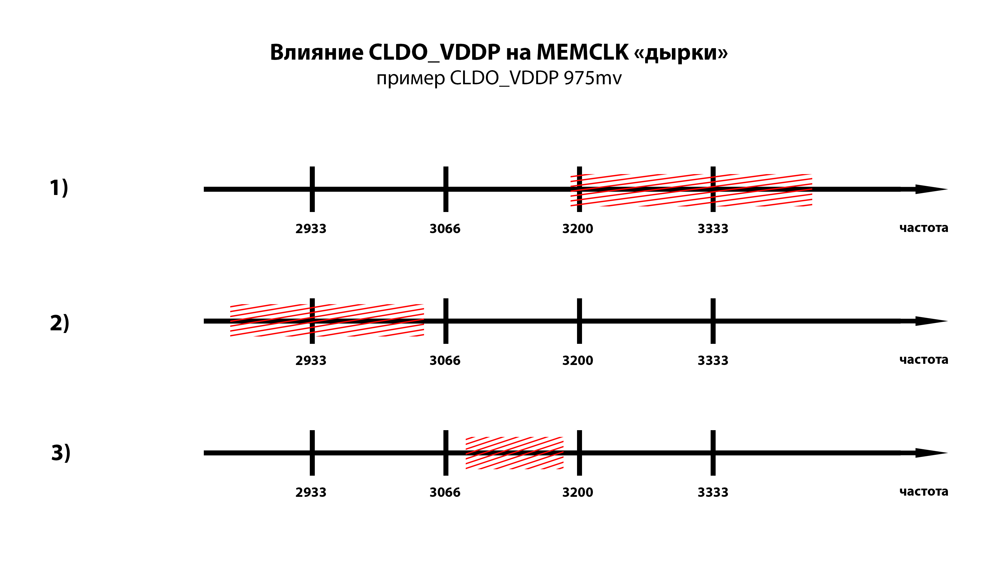 Если все системы одинаковые почему такие результаты? Давайте разбираться. Суть заключается в том что каждый контроллер памяти (IMC) имеет собственные технические характеристики ("вольтажные" и временные) и при идентичном напряжении / частоте он будет вести себя по иному, а именно будет по разному получать доступ к памяти. Красным помечены наши MEMCLK дырки, это те самые дырки-посредники через которые наш контроллер памяти связывается с оперативной памятью, и если дырки нет в выбранном нами частотном промежутке - система не стартует или стартует но память работает с ошибками. У Вас думаю появился вопрос как эти дырки двигать и расширять - все очень просто, вольтаж CLDO_VDDP позволяет проводить данные манипуляции. Единственная сложность заключается в том, что данные дырки математически не вычислить. Яркий пример CLDO_VDDP 425 которое является волшебным для многих. Дырка этого вольтажа находится в районе 3300-3500мгц, но опять таки далеко не для всех систем. Как показали наши внутренние тесты не у всех оно работает, повторюсь все IMC разные и требуют разный вольтаж CLDO_VDDP для достижения одной и той же частоты.