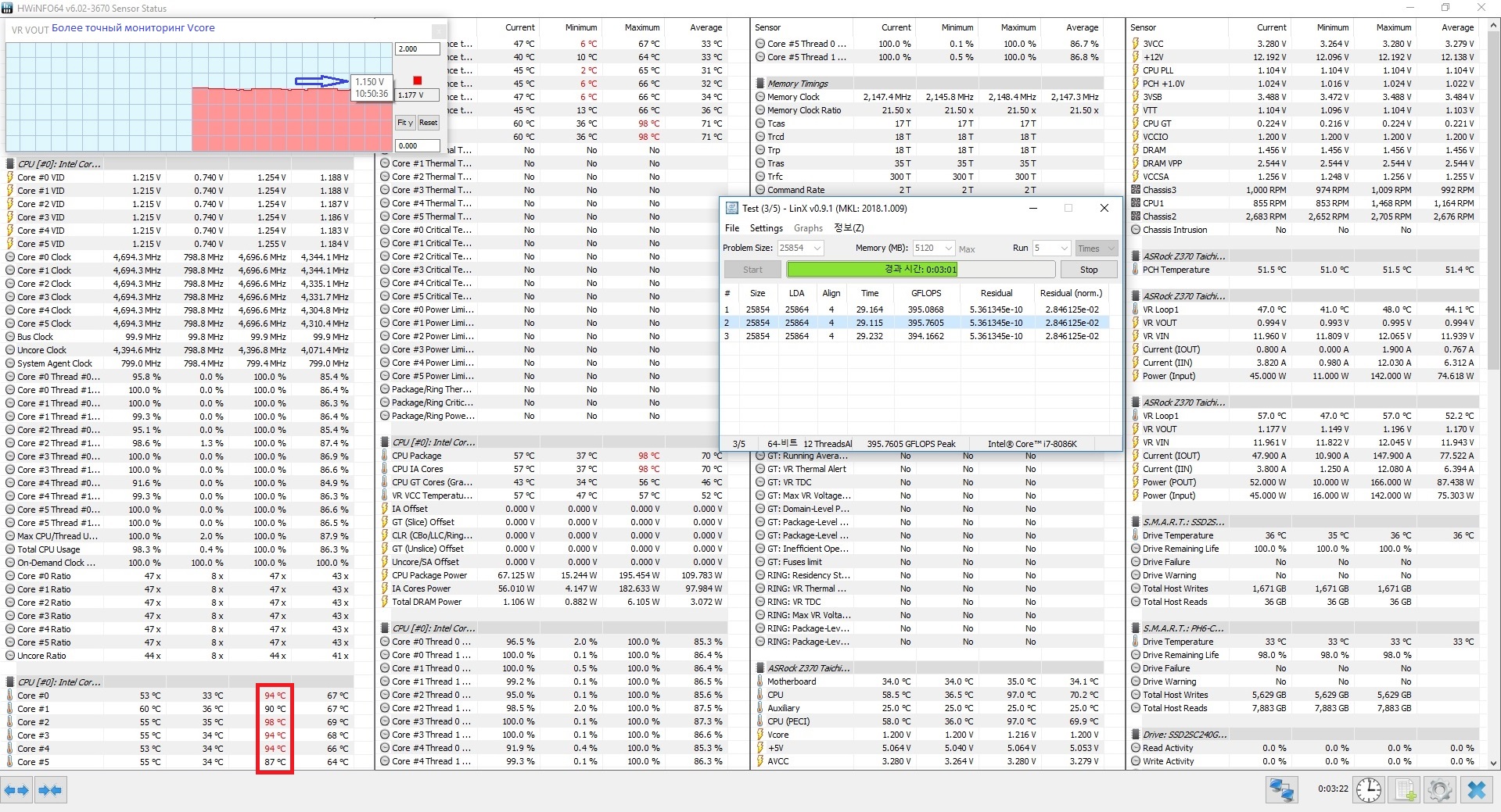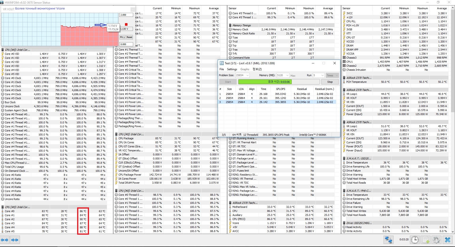 Полученный результат должен иметь следующий вид: Скриншот рабочего стола после прохождения >9 циклов (т.е. между 9 и 10 проходами). Вместе с LinX на рабочем столе должны быть развернуты CPU-Z (первая вкладка) и Core Temp, это обязательный минимум. Такой набор программ даст информацию о напряжении и температурах под нагрузкой-простоем. По желанию можете добавить другие программы, показывающие дополнительную информацию о вашей системе, например третью вкладку CPU-Z, которая покажет модель материнской платы и версию BIOS. Пример результата разгона: Mad Max, 5100 МГц (AVX 0), i7-8086K, HT-ON, Cache 4700, Vcore=1.36V, Batch L805E123, Gigabyte Z370 Aorus Gaming 7 (bios F6), Be Quiet! Dark Rock Pro 4, ЖМ под HS, Windows 10 Pro 64-bit 1809, LinX 0.9.3 64bit.