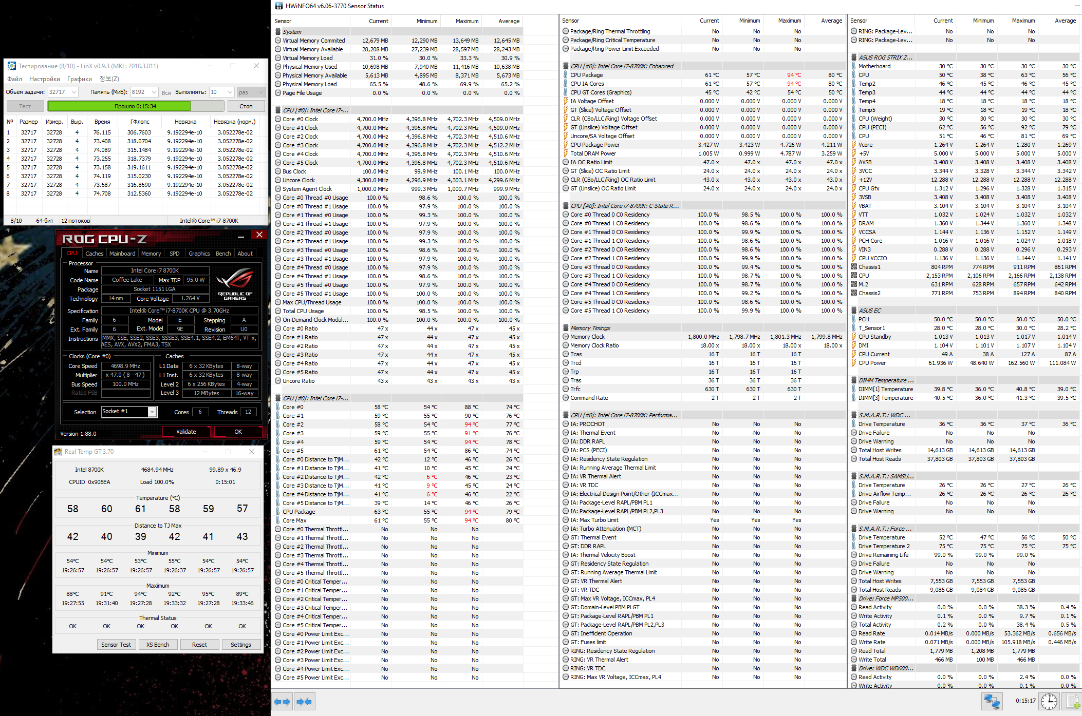 В стресс тестах стоит Power Limit1 - 165W, Power Limit2 - 195W, и во всяких Prime64-Linx частота-напряжение падают и не дают процессору работать в жутких 200+W, смысла как-то и нет в них, только можно спалить материнскую плату. LinX и так выбивает свои 390-410Гфлопс, результаты в Cinebench R20 на 3-5% ниже, в старом R15, не изменились. В реальных рендерингах, стабилизациях видео, также результат падает на 3-5%, но и процессор не молотит на жутких 200+W, а всегда ограничен на в целом безопасных на длительную работу 165W. Дополнительные стресс тесты можно проводить на 4-6 потоках, чтобы процессор работал на 5ГГц, но умещался в 165W.