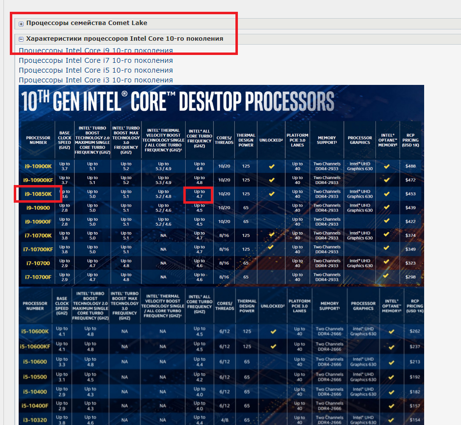 Характеристики процессоров Intel Core 10-го поколения