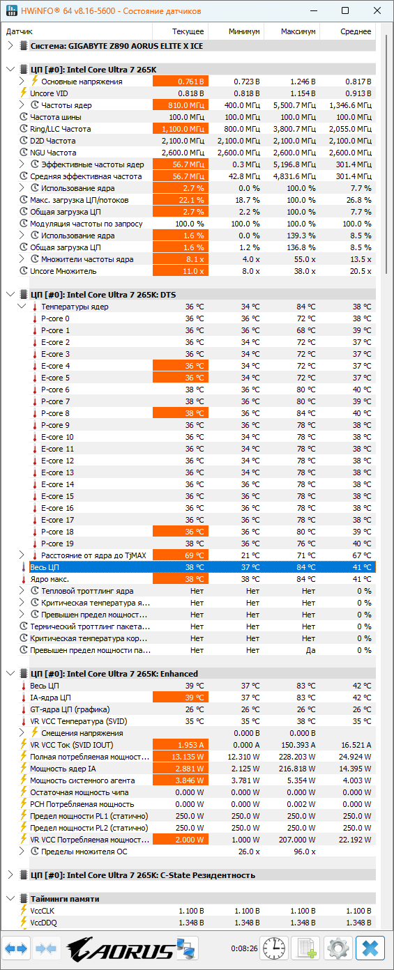 Есть тут у кого неть 265к? Сколько кушает при прогоне сб23? по программе и из розетки. У меня 240 ватт по проге и 315 из розетки. Это если профиль интел по умолчанию, а если гигабайтовский профиль выбрать без лимитов, то кушает даже меньше около 220-230 ватт. Кулер арктик фризер 36.