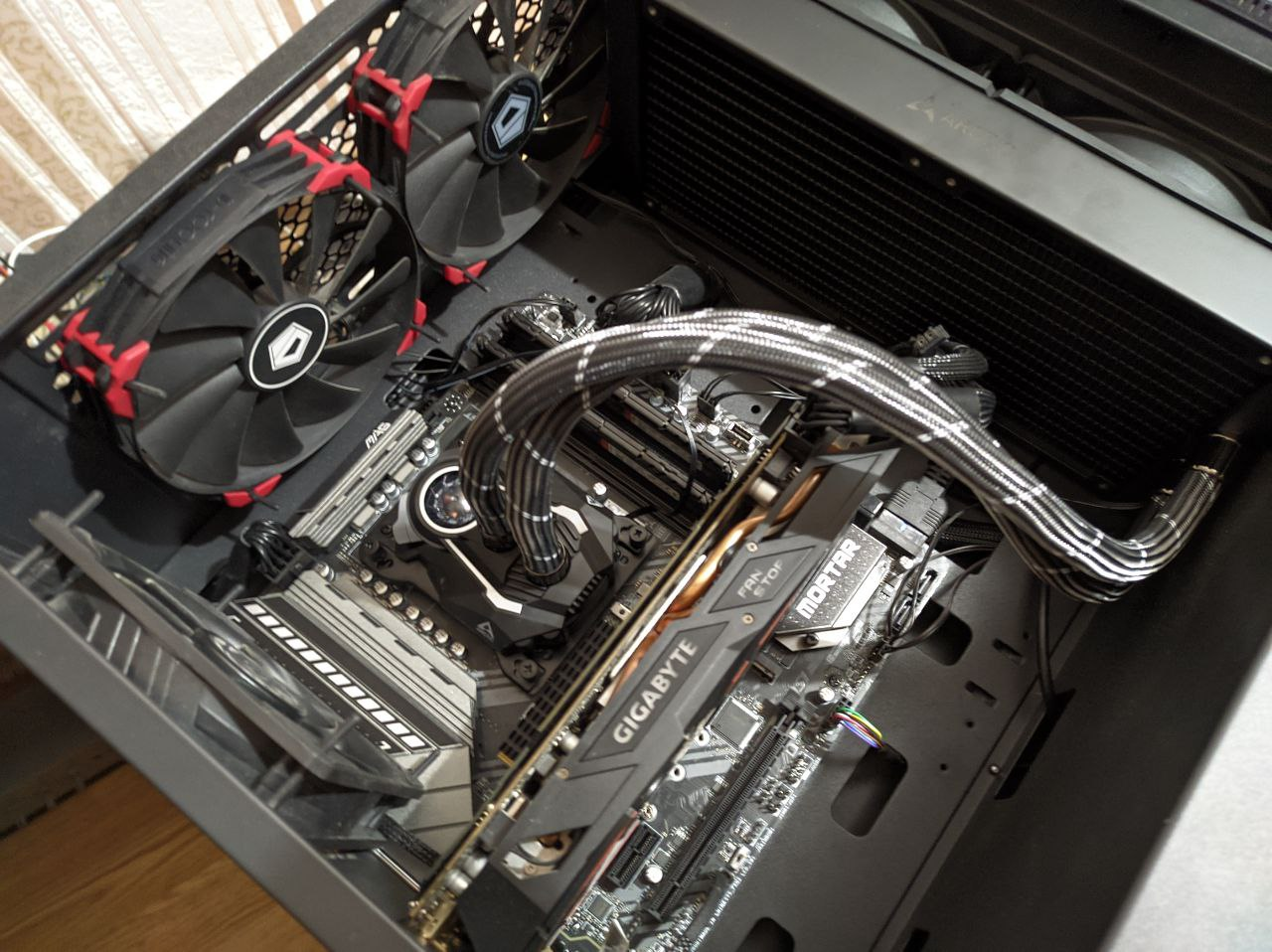 Там человек говорит о том что шлангами вниз установить зачастую проблематично, а не неправильно. У меня никаких проблем не было, шланги проходят сбоку от видеокарты, между видеокартой и стеклом корпуса.