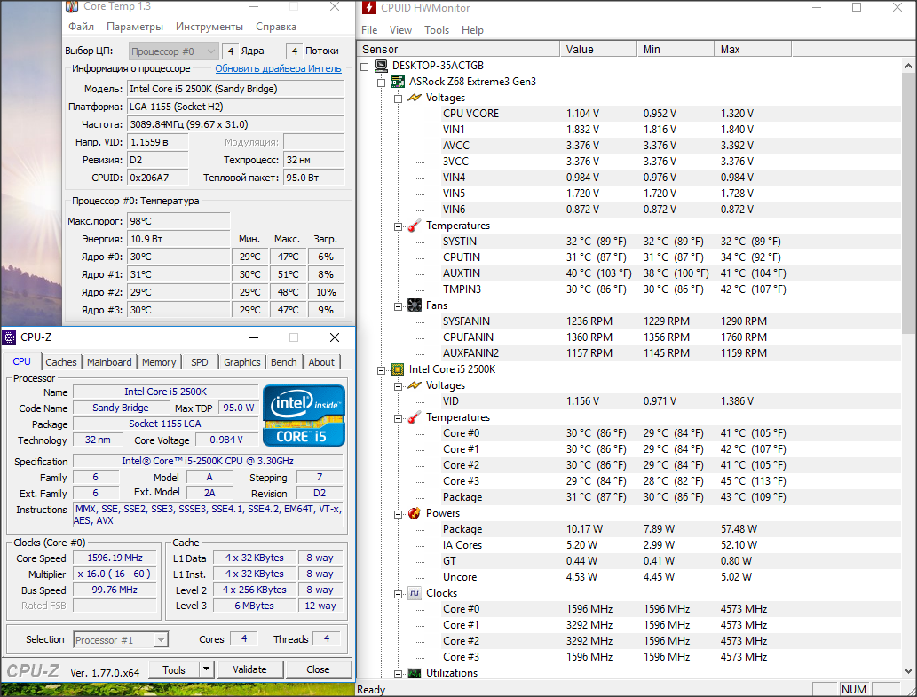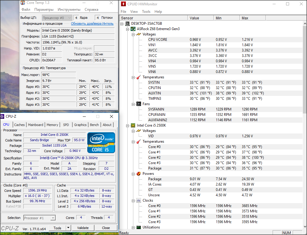 Пробовал вручную множитель и фиксированное напряжение, все равно разброс по данным CPU Z и Core temp оставался и последствия те же.