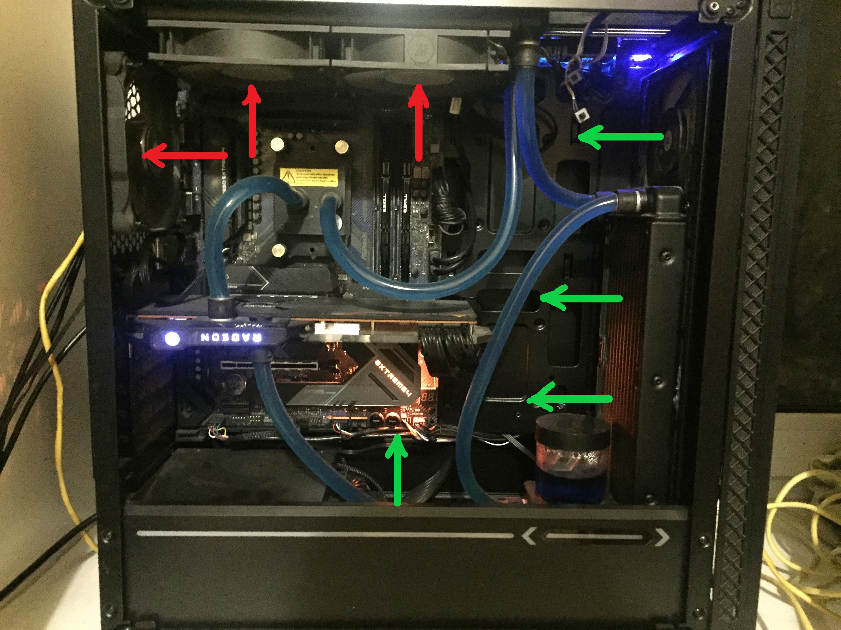 Задний вентиль на выдув, 2 спереди на выдув горячего воздуха от видяхи и радиатора сверху, сверху радиатор СЖО и вентиляторы на вдув в корпус. И можно взять AIO не под 3 вентилятора на радиатор, а под 2, разница небольшая будет.