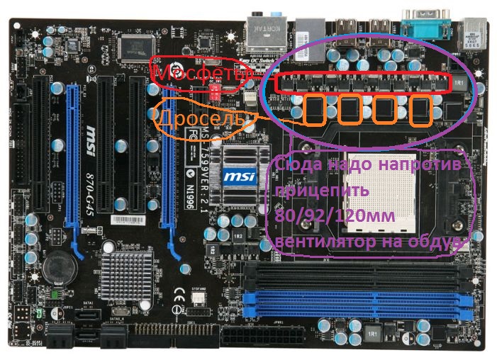 Тебе нужно повесить/прицепить вентилятор на обдув мосфетов. Еще учитывая насколько у тебя маленький радиатор на чипсете, прицепить вентилятор и на него. Это там где написано MSI.