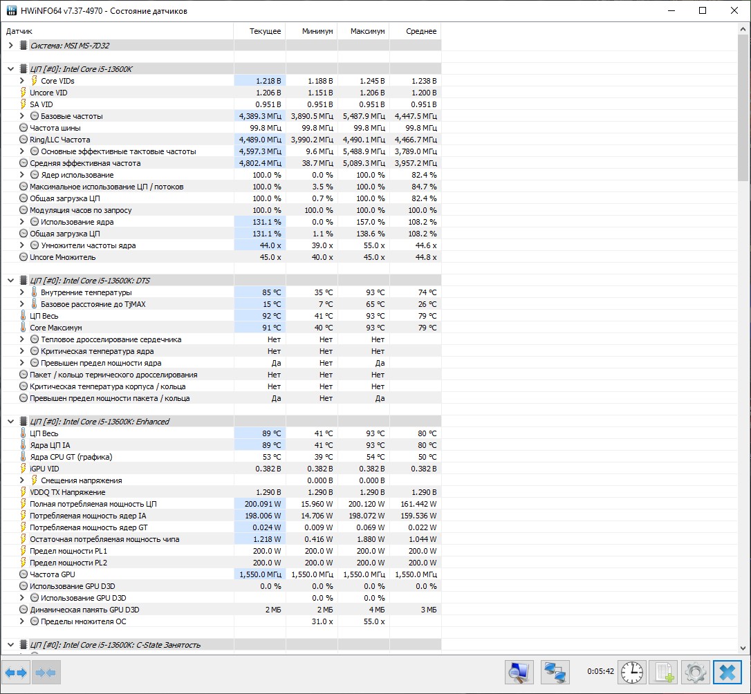 Запустил прошел первый цикл, заметил что частота проца гуляет от 5000 до 5500 в аиде, и проц упирается в 200wt потребления