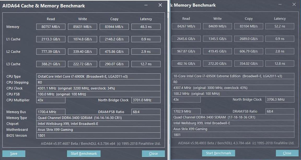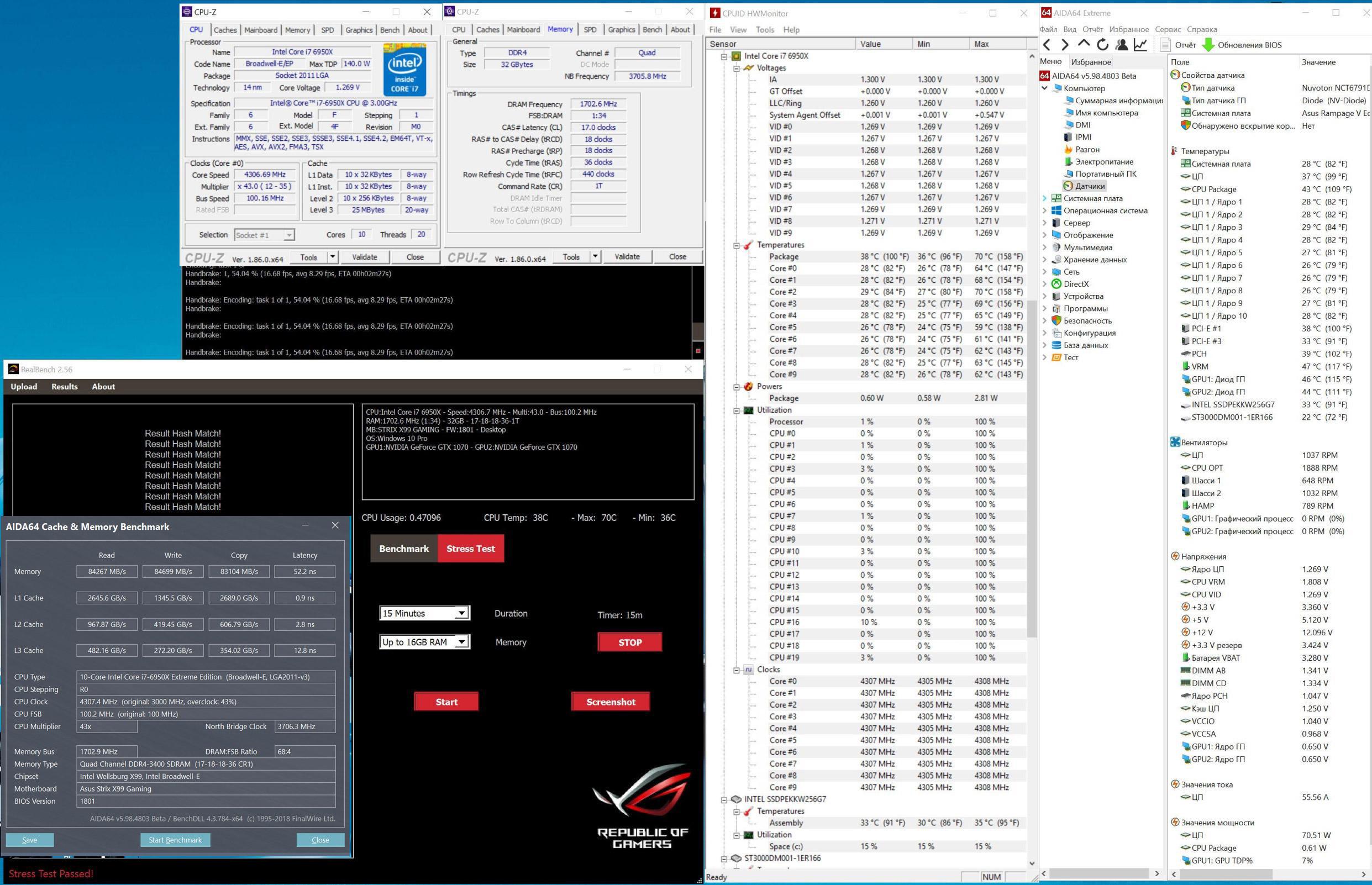 Ну вот, пришло время разгона i7 - 6950X. Конечно старичок звезд с неба не хватает но и лицом в грязь не падает. Идельный процессор для игр в любом разрешении. 4300MHz-процессорю 3700MHz-кэш. 3400MHz-память. И соответственно напряжения 1.27,1.23v Можно и 4400MHz но с разгоном кэша и памяти бдет тяжеловато, напругу надо задирать вызе 1.3v да и количество ватт увеличивается больше 300 и соответственно ампер, что не очень хрошо. В биосе почти ничего не менял, кроме базовых напряжений прцессора, кэша и входного напряжения 1.8v и тайминги чуть подправил. Да, чуть не забыл, конечно SA и IO, куда без них. Проверил все зто в RealBench, вроде неплохо получилось-для начала, а там посмотрим, может что нибудь поправим потом. Скрин прилагается.