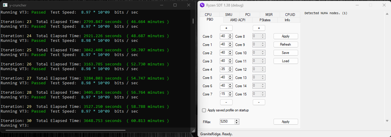 Прикол в том, что y-cruncher может пройти -20 на последнем ядре а Аида его отрыгнёт минуты через две, но зато легко проходит на остальных ядрах -40. Это я к тому, что Аида отличный тест в плане быстрой оценки стабильности, но y-cruncher нужно обязательно запускать после неё.