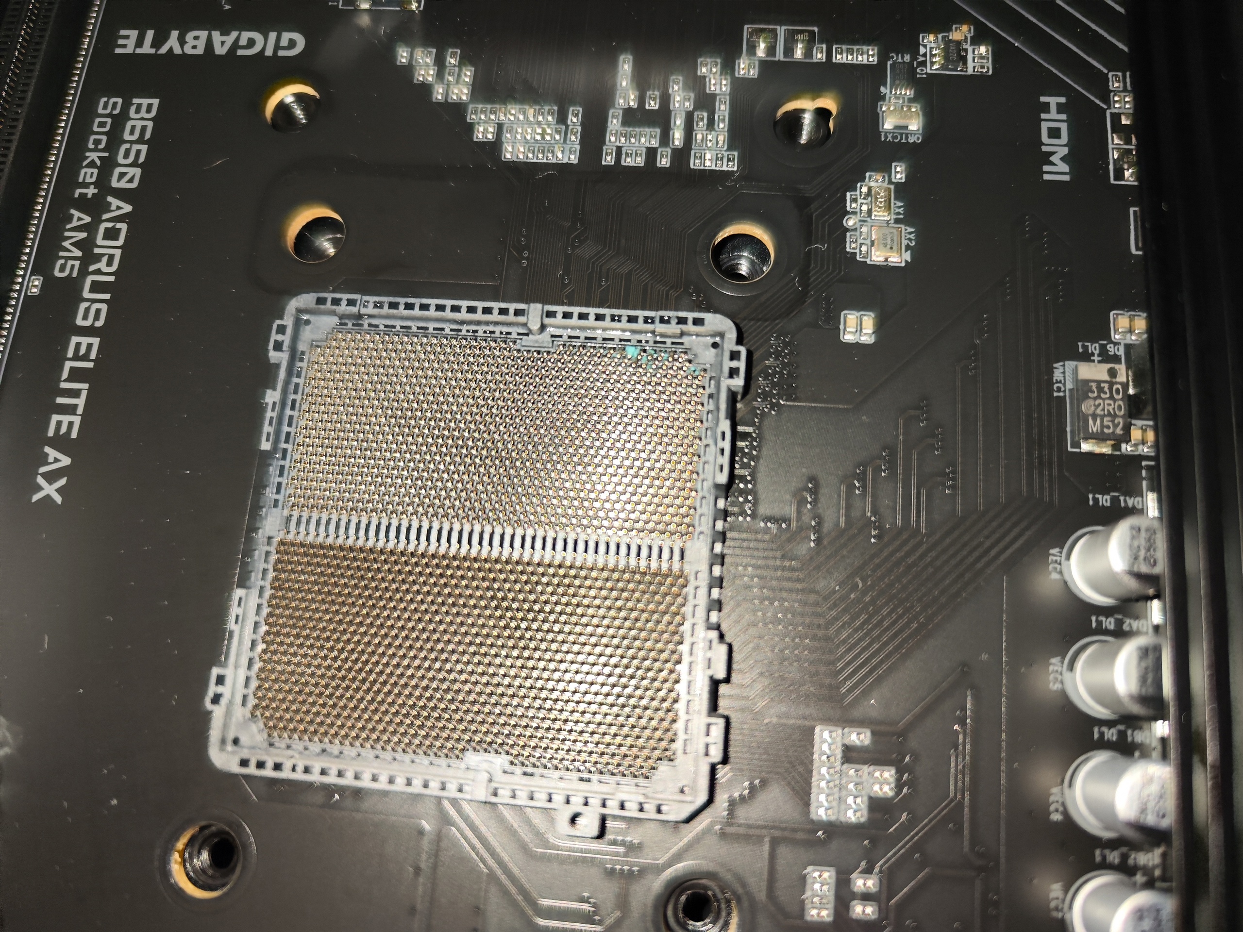 Добавлено спустя 32 минуты 9 секунд: Кажется нашел причину, правда не знаю как так вышло. Старался все внимательно собрать, так как не в первый раз. В общем в сокете какая то зеленая дрянь(хотя такой одежды или термопасты у меня нет или вообще чего то такого цвет, может оно уже было, а я не заметил), и процессор частично коричневый стал.